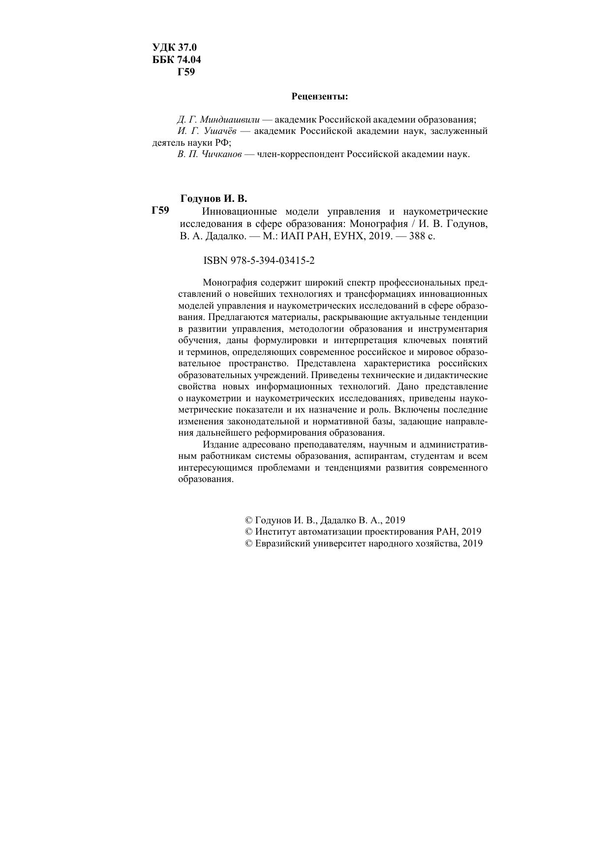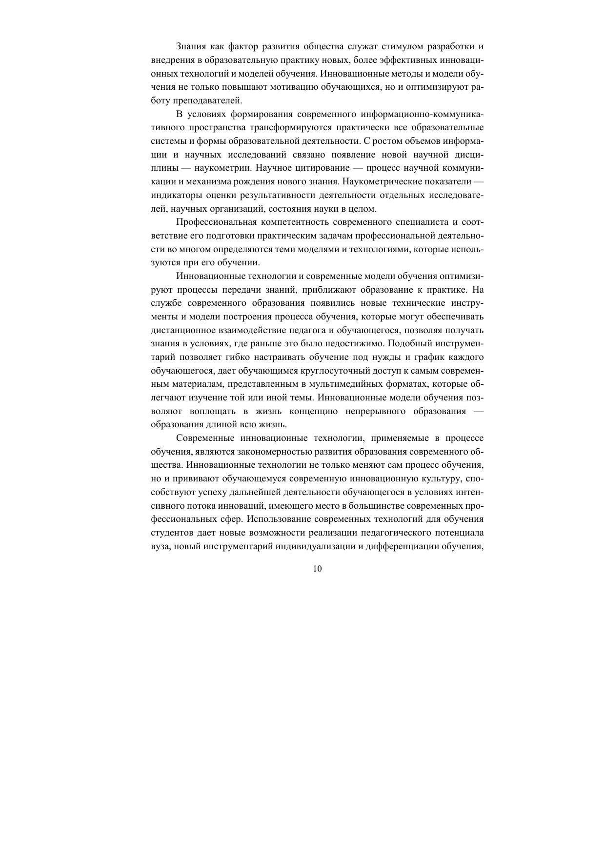 Монография содержит широкий спектр профессиональных представлений о новейших технологиях и трансформациях инновационных моделей управления и наукометрических исследований в сфере образования. Предлагаются материалы, раскрывающие актуальные тенденции в развитии управления, методологии образования и инструментария обучения, даны формулировки и интерпретация ключевых понятий и терминов, определяющих современное российское и мировое образовательное пространство. Представлена характеристика российских образовательных учреждений. Приведены технические и дидактические свойства новых информационных технологий. Дано представление о наукометрии и наукометрических исследованиях, приведены наукометрические показатели и их назначение и роль. Включены последние изменения законодательной и нормативной базы, задающие направления дальнейшего реформирования образования. Издание адресовано преподавателям, научным и административным работникам системы образования, аспирантам, студентам и всем интересующимся проблемами и тенденциями развития современного образования.
