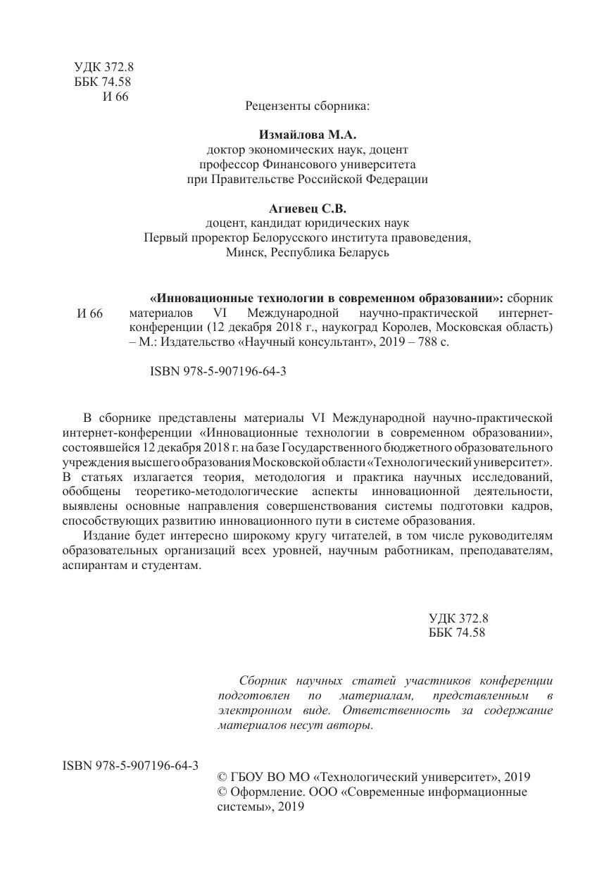 В сборнике представлены материалы VI Международной научно-практической интернет-конференции «Инновационные технологии в современном образовании», состоявшейся 12 декабря 2018 г. на базе Государственного бюджетного образовательного учреждения высшего образования Московской области «Технологический университет». В статьях излагается теория, методология и практика научных исследований, обобщены теоретико-методологические аспекты инновационной деятельности, выявлены основные направления совершенствования системы подготовки кадров, способствующих развитию инновационного пути в системе образования. Издание будет интересно широкому кругу читателей, в том числе руководителям образовательных организаций всех уровней, научным работникам, преподавателям, аспирантам и студентам.