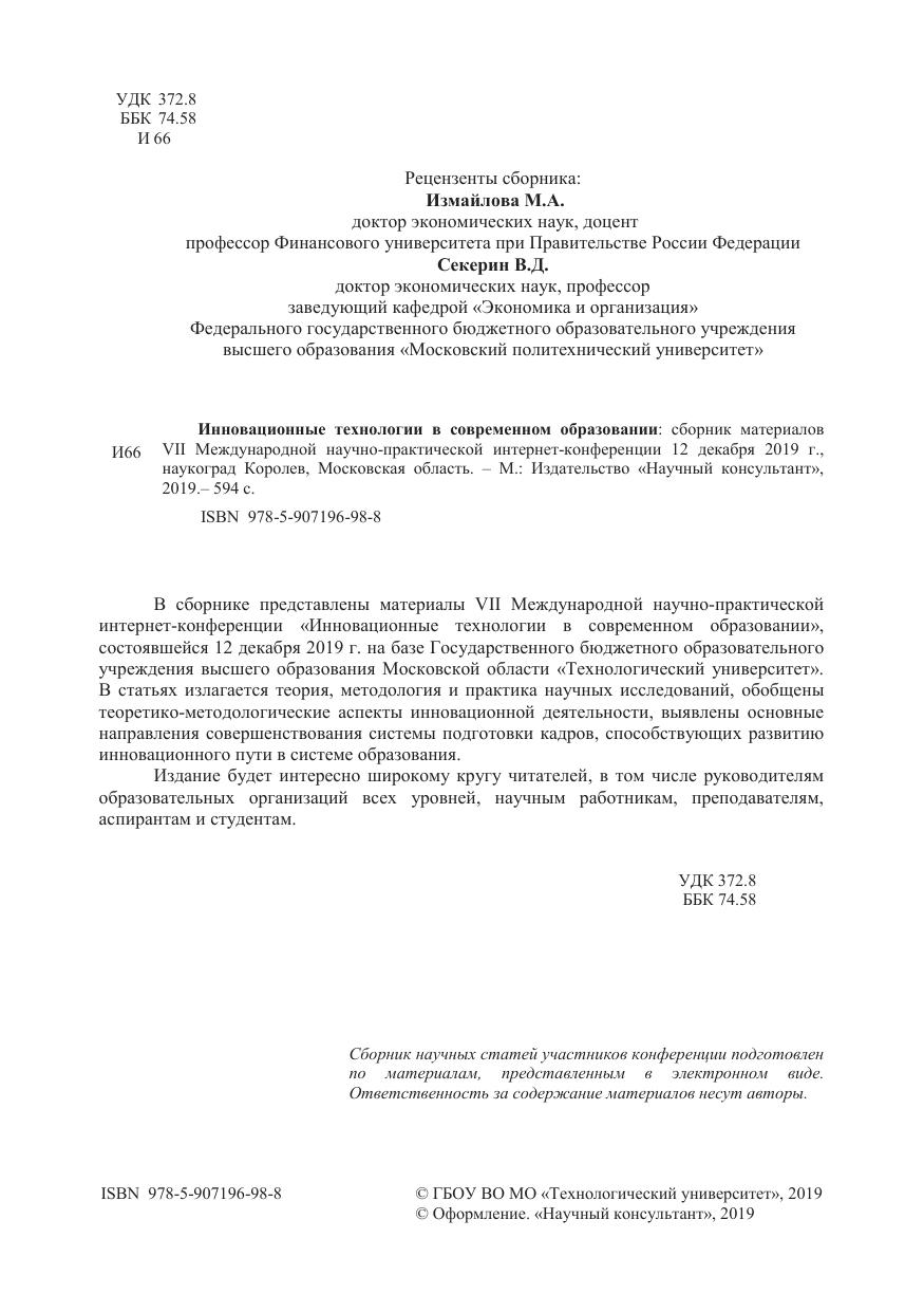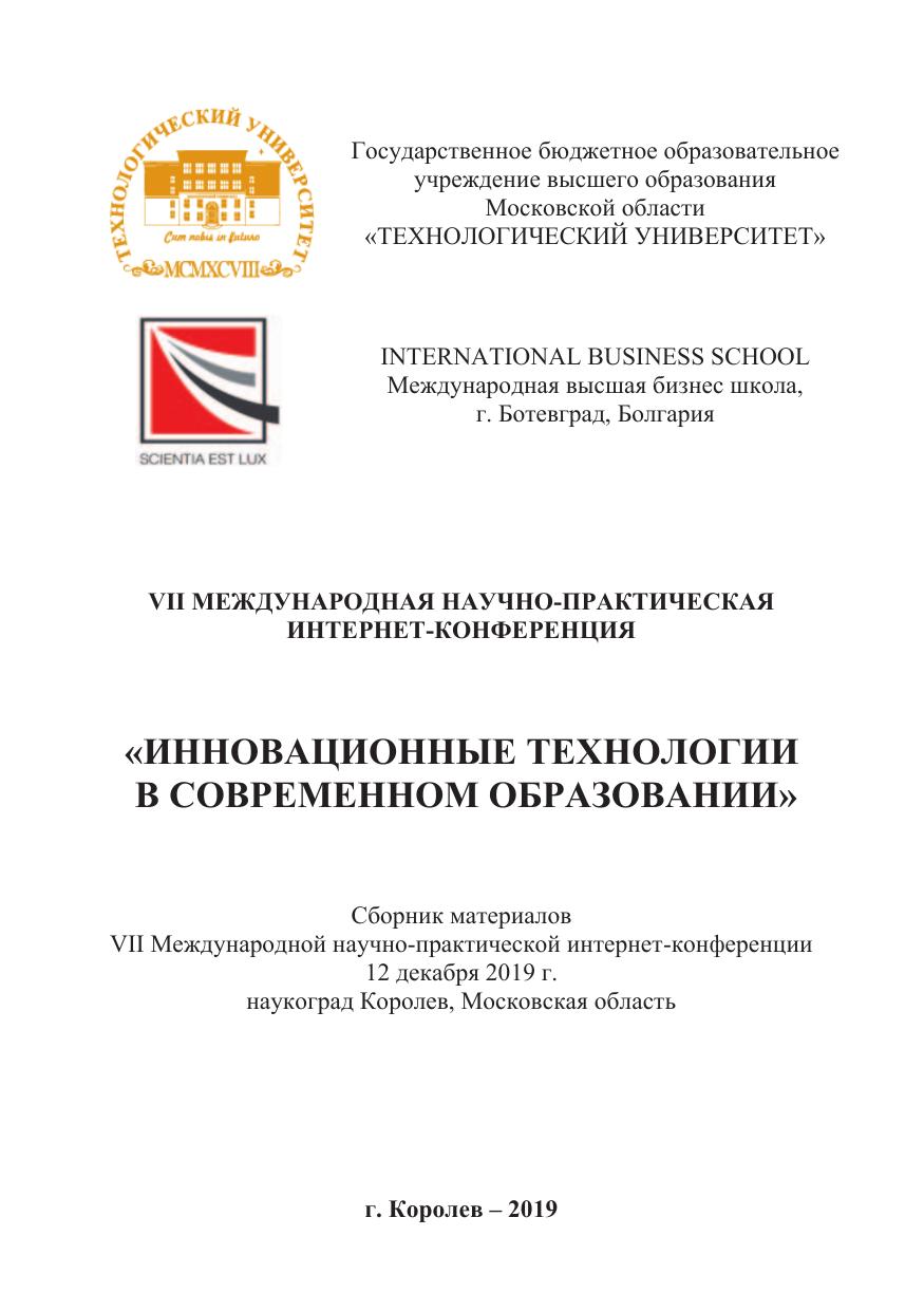 В сборнике представлены материалы VII Международной научно-практической интернет конференции «Инновационные технологии в современном образование», состоявшейся 12 декабря 2019 г. на базе Государственного бюджетного образовательного учреждения высшего образования Московской области «Технологический университет». В статьях излагается теория, методология и практика научных исследований, обобщены теоретико-методологические аспекты инновационной деятельности, выявлены основные направления совершенствования системы подготовки кадров, способствующих развитию инновационного пути в системе образования.