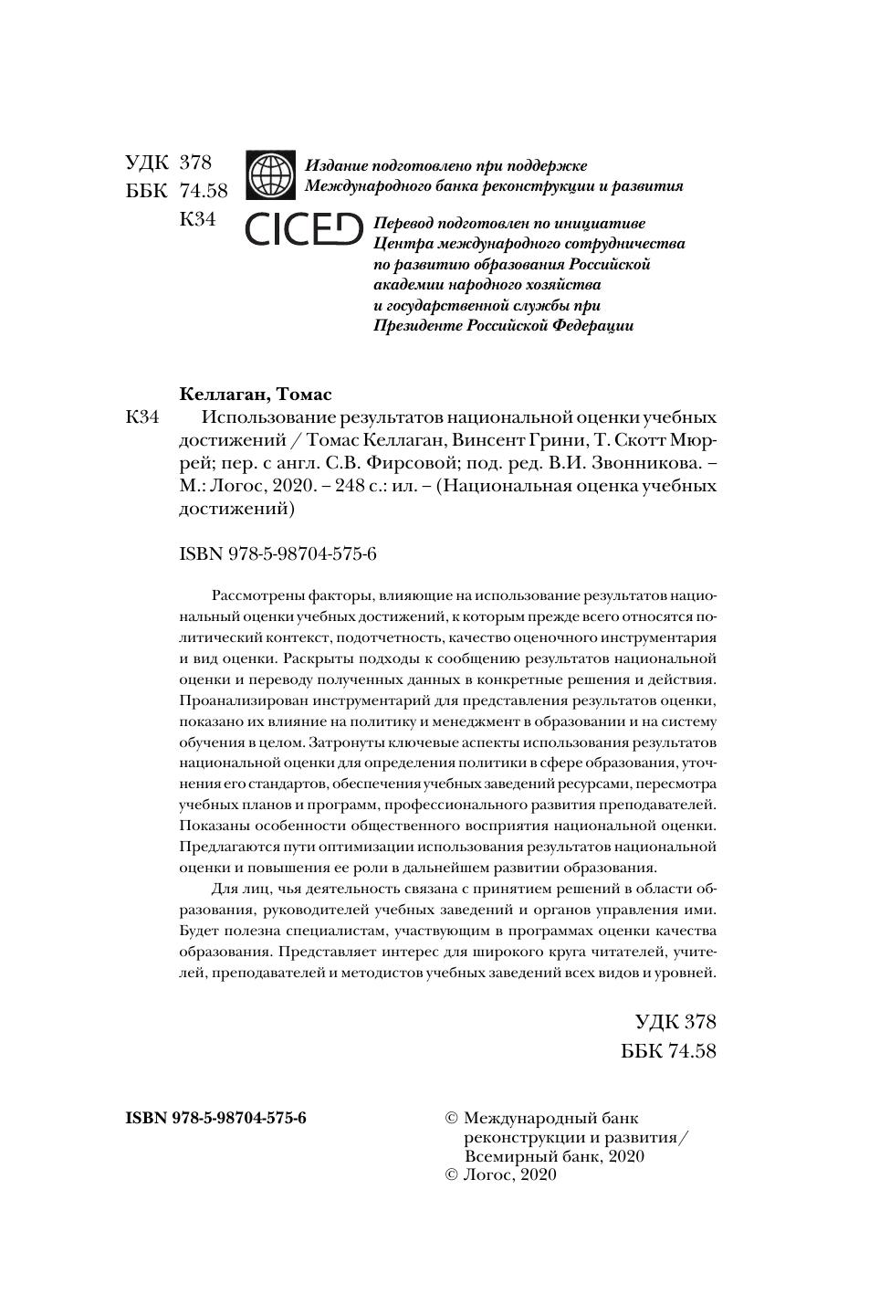 Рассмотрены факторы, влияющие на использование результатов национальный оценки учебных достижений, к которым прежде всего относятся политический контекст, подотчетность, качество оценочного инструментария и вид оценки. Раскрыты подходы к сообщению результатов национальной оценки и переводу полученных данных в конкретные решения и действия. Проанализирован инструментарий для представления результатов оценки, показано их влияние на политику и менеджмент в образовании и на систему обучения в целом. Затронуты ключевые аспекты использования результатов национальной оценки для определения политики в сфере образования, уточнения его стандартов, обеспечения учебных заведений ресурсами, пересмотра учебных планов и программ, профессионального развития преподавателей. Показаны особенности общественного восприятия национальной оценки. Предлагаются пути оптимизации использования результатов национальной оценки и повышения ее роли в дальнейшем развитии образования. Для лиц, чья деятельность связана с принятием решений в области образования, руководителей учебных заведений и органов управления ими. Будет полезна специалистам, участвующим в программах оценки качества образования. Представляет интерес для широкого круга читателей, учителей, преподавателей и методистов учебных заведений всех видов и уровней.