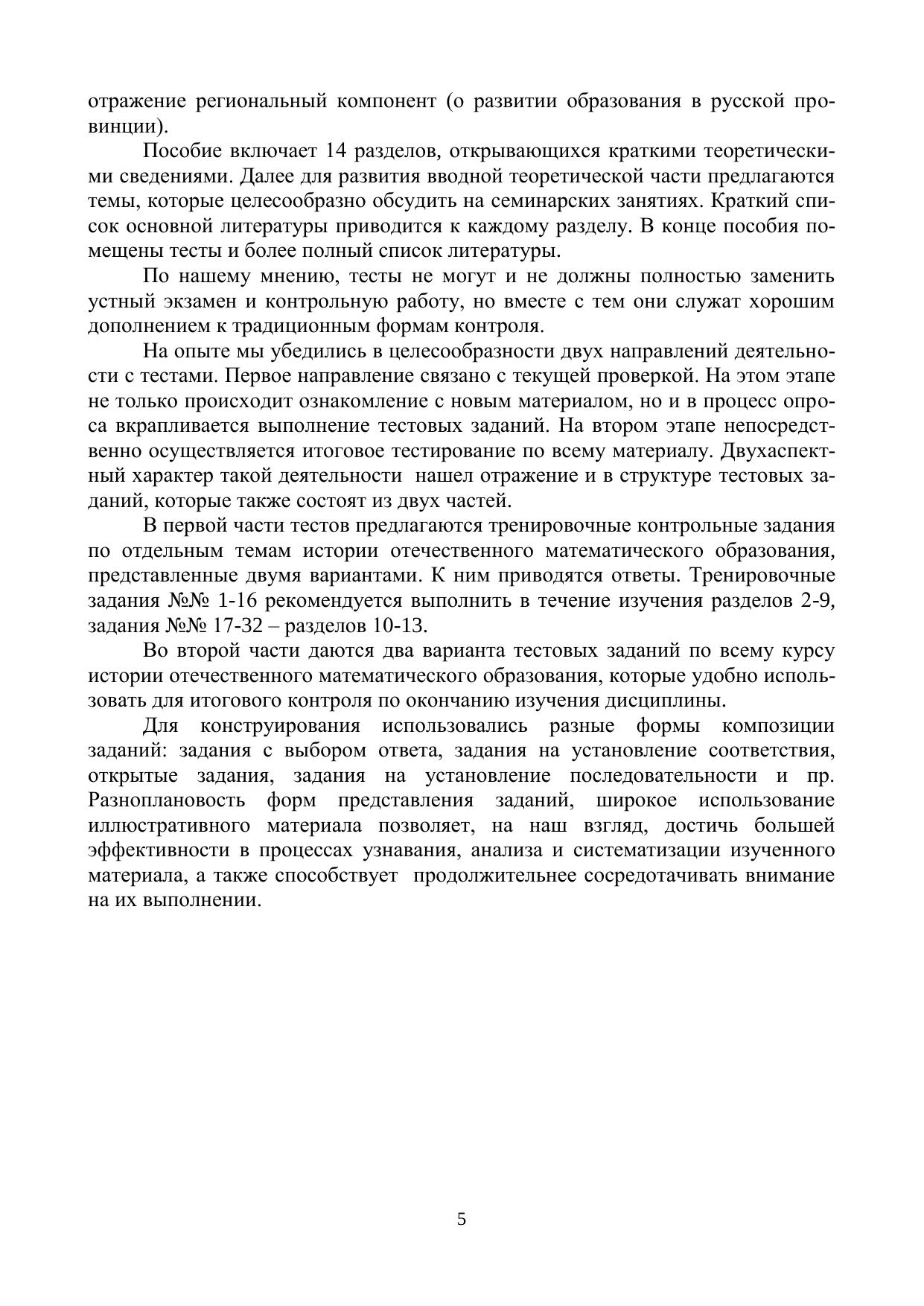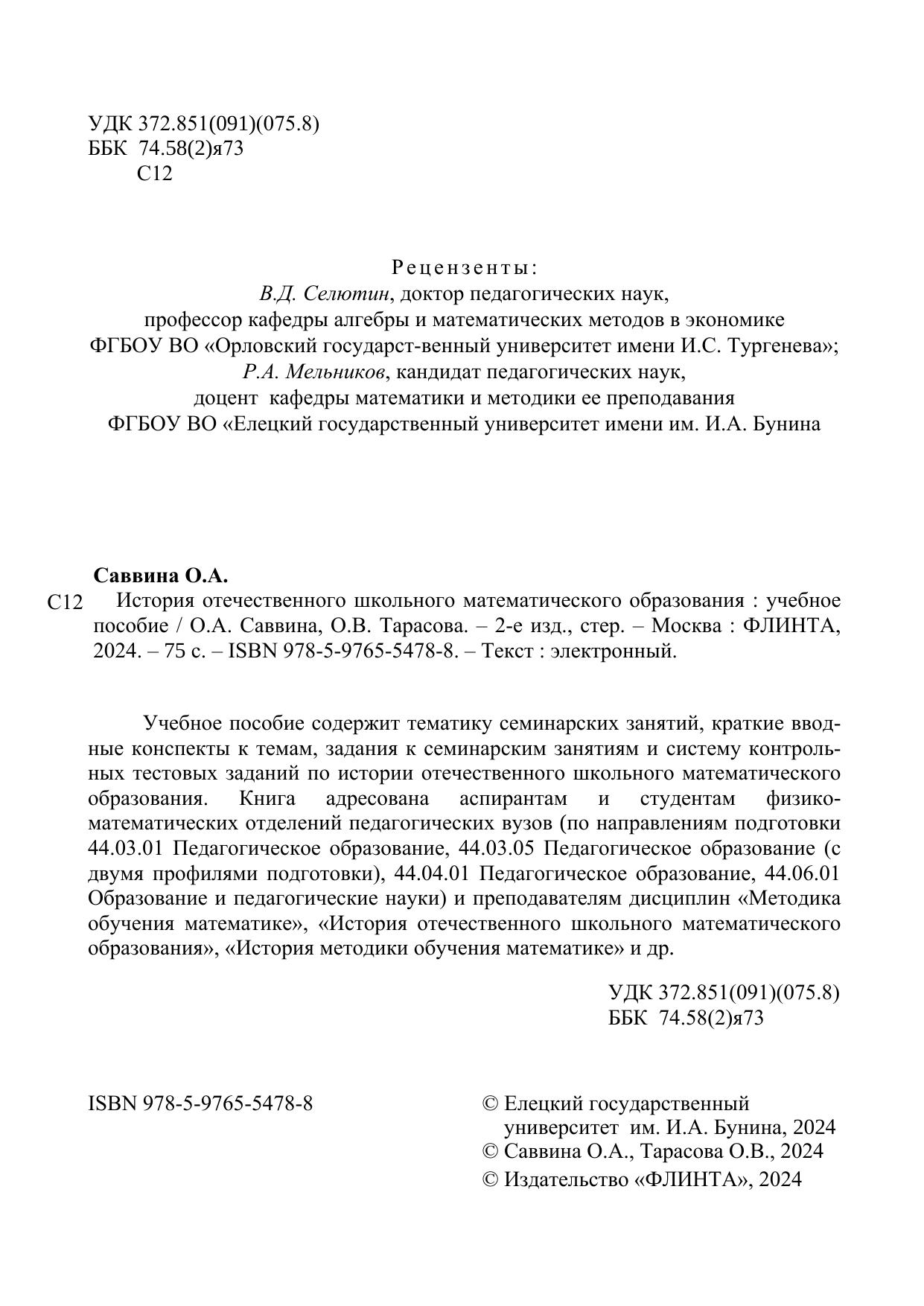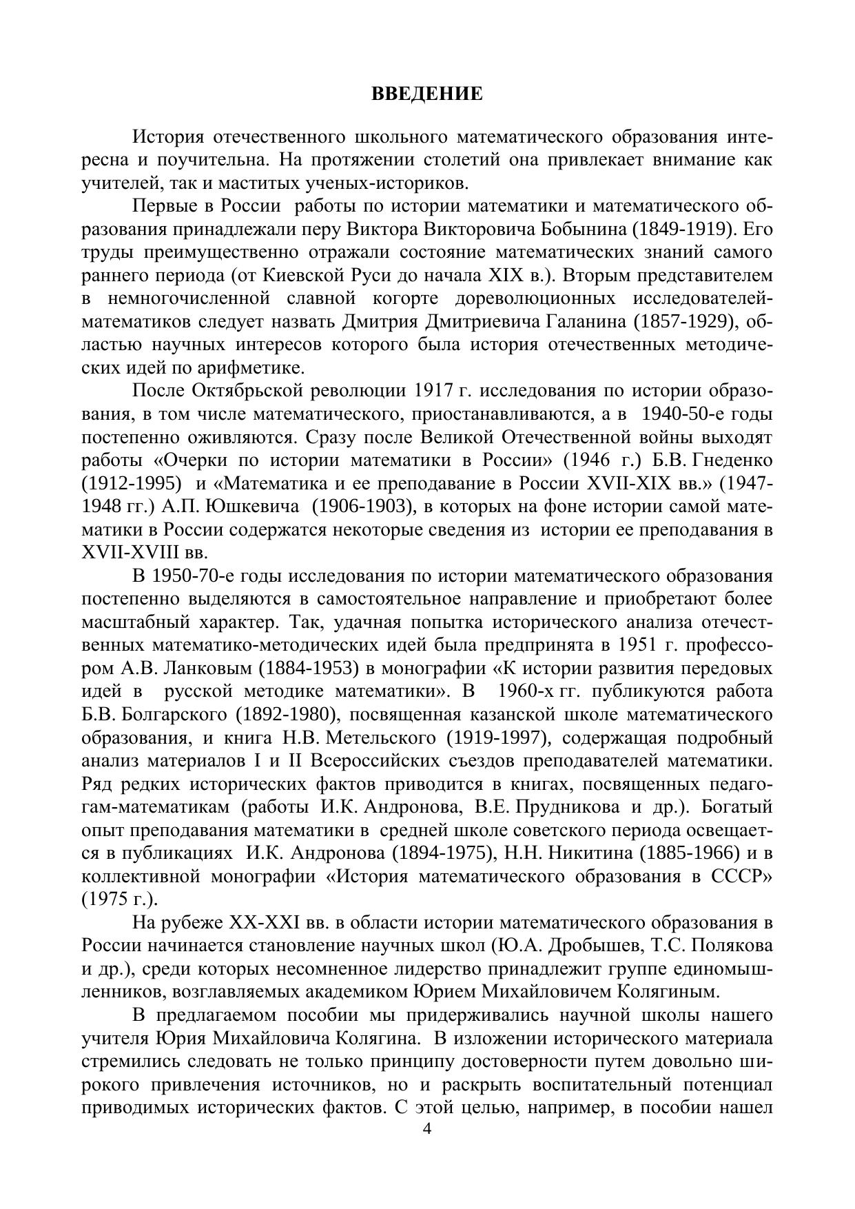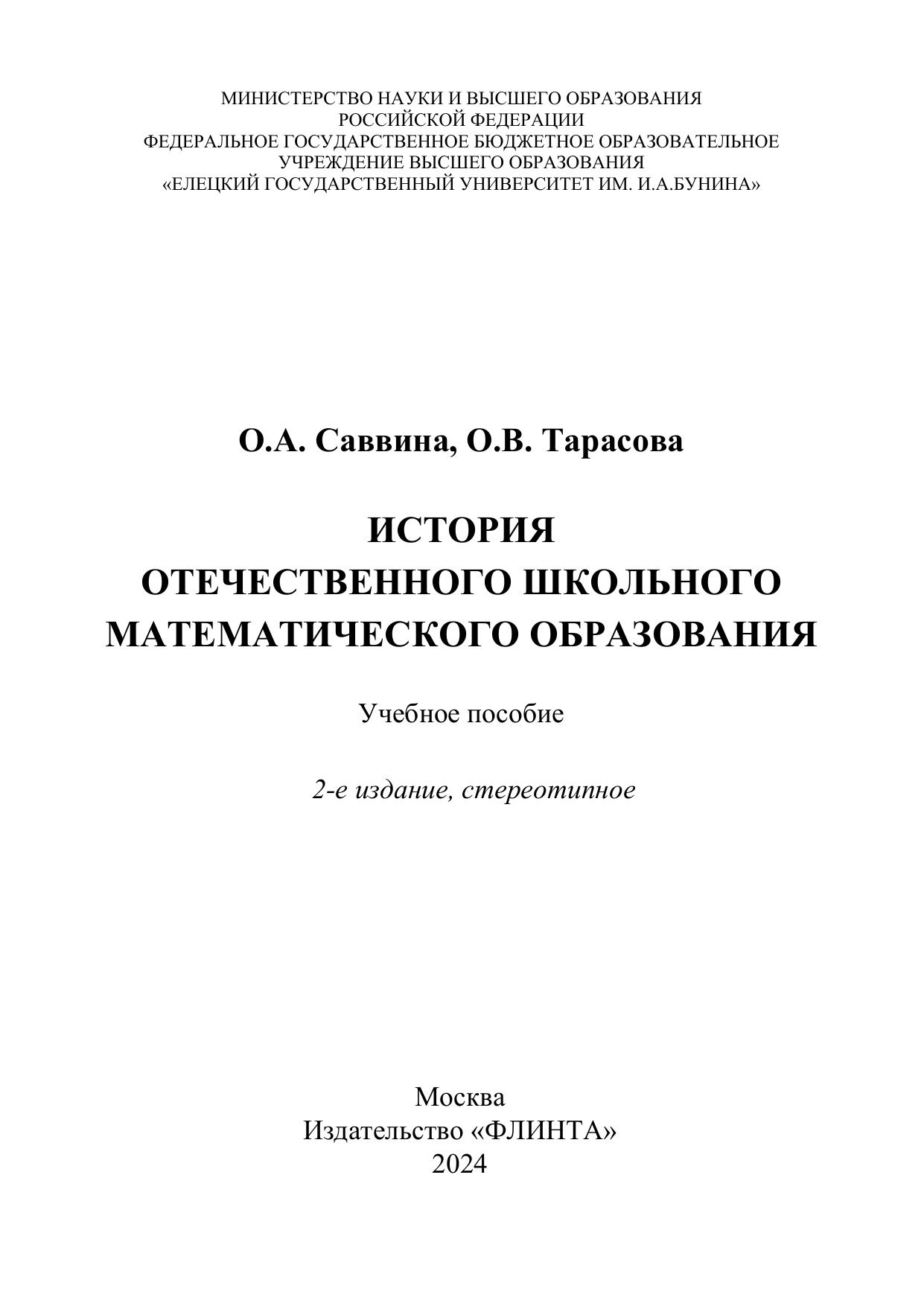Учебное пособие содержит тематику семинарских занятий, краткие вводные конспекты к темам, задания к семинарским занятиям и систему контрольных тестовых заданий по истории отечественного школьного математического образования. Книга адресована аспирантам и студентам физико-математических отделений педагогических вузов (по направлениям подготовки 44.03.01 Педагогическое образование, 44.03.05 Педагогическое образование (с двумя профилями подготовки), 44.04.01 Педагогическое образование, 44.06.01 Образование и педагогические науки) и преподавателям дисциплин «Методика обучения математике», «История отечественного школьного математического образования», «История методики обучения математике» и др.