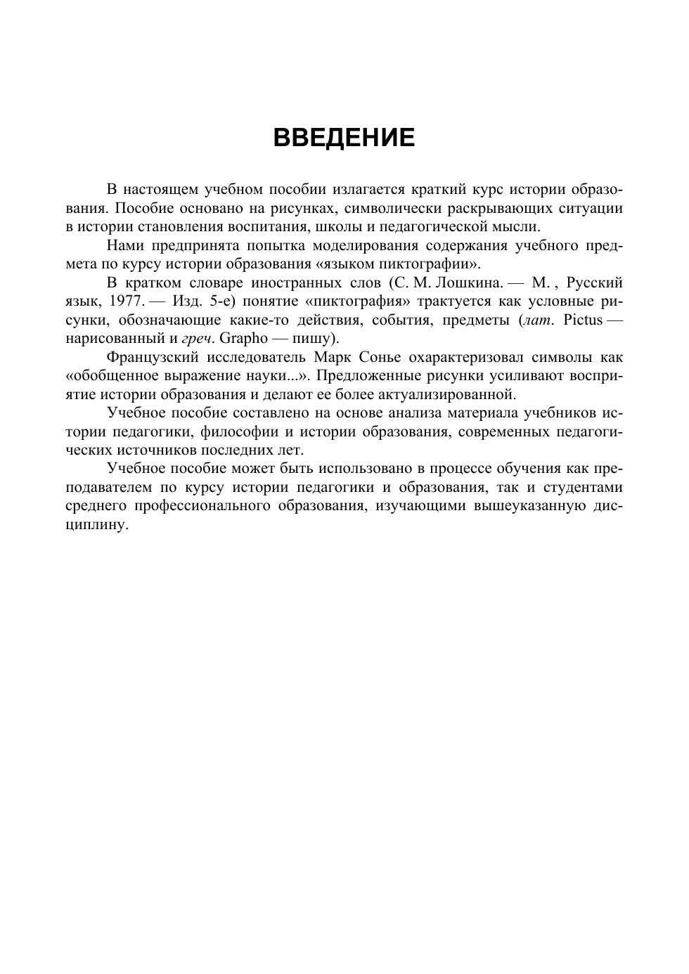 В настоящем учебном пособии излагается краткий курс истории педагогики во всем ее объеме. Пособие основано на пиктограммах — рисунках, символически раскрывающих ситуации в истории становления воспитания, образования и педагогической мысли. Французский исследователь Марк Сонье охарактеризовал символы как «обобщенное выражение науки…». Предложенные рисунки усиливают восприятие истории педагогики и делают занятия по ее изучению более яркими, живыми и запоминающимися. Соответствует современным требованиям Федерального государственного образовательного стандарта среднего профессионального образования и профессиональным квалификационным требованиям. Учебное пособие предназначено для студентов профессиональных образовательных организаций педагогических направлений подготовки, а также для преподавателей, стремящихся использовать новые, нетрадиционные подходы к преподаванию своего предмета.
