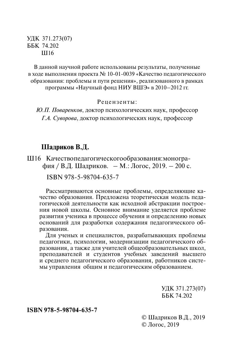 Рассматриваются основные проблемы, определяющие качество образования. Предложена теоретическая модель педагогической деятельности как исходной абстракции построения новой школы. Основное внимание уделяется проблеме развития ученика в процессе обучения и определению новых оснований для разработки содержания педагогического образования. Для ученых и специалистов, разрабатывающих проблемы педагогики, психологии, модернизации педагогического образования, а также для учителей общеобразовательных школ, преподавателей и студентов учебных заведений высшего и среднего педагогического образования, работников системы управления общим и педагогическим образованием.