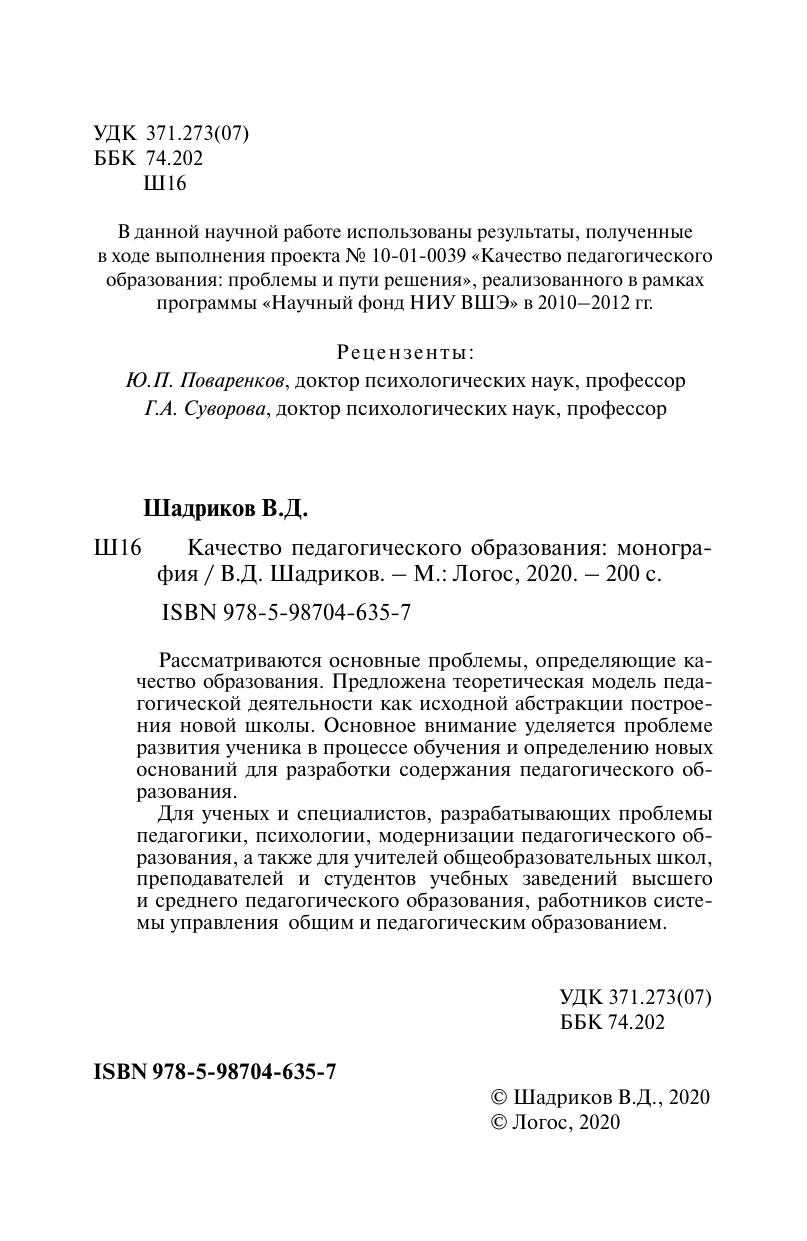 Рассматриваются основные проблемы, определяющие качество образования. Предложена теоретическая модель педагогической деятельности как исходной абстракции построения новой школы. Основное внимание уделяется проблеме развития ученика в процессе обучения и определению новых оснований для разработки содержания педагогического образования. Для ученых и специалистов, разрабатывающих проблемы педагогики, психологии, модернизации педагогического образования, а также для учителей общеобразовательных школ, преподавателей и студентов учебных заведений высшего и среднего педагогического образования, работников системы управления общим и педагогическим образованием.
