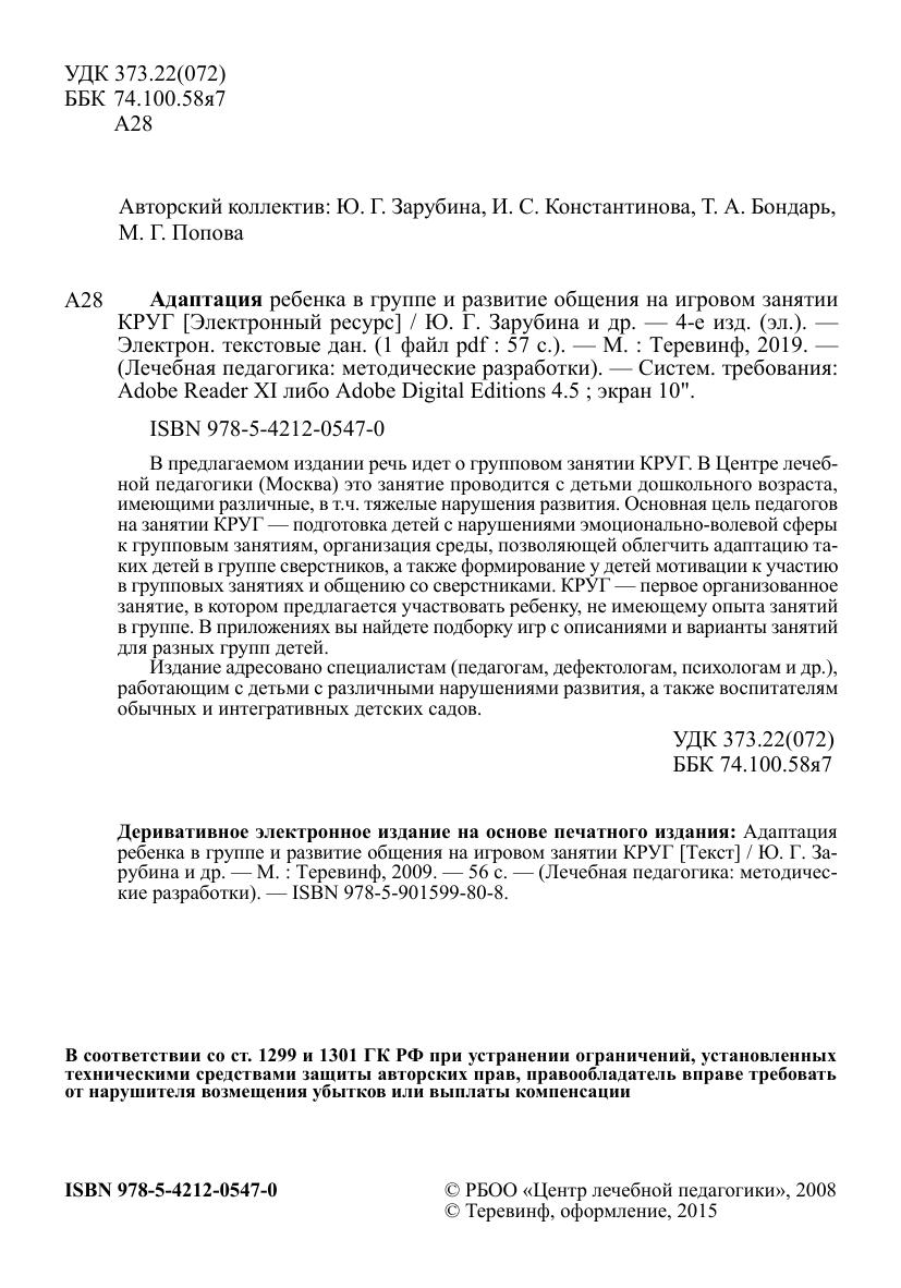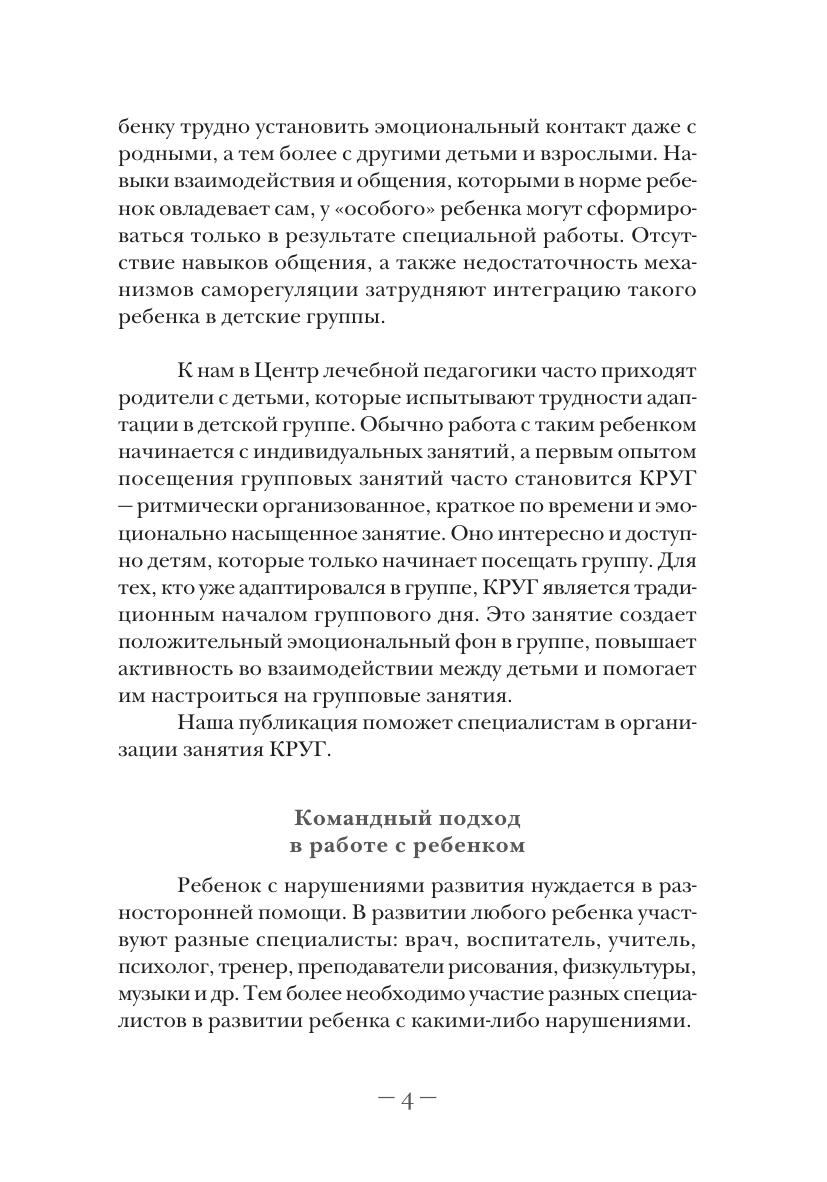 В предлагаемом издании речь идет о групповом занятии КРУГ. В Центре лечебной педагогики (Москва) это занятие проводится с детьми дошкольного возраста, имеющими различные, в т.ч. тяжелые нарушения развития. Основная цель педагогов на занятии КРУГ — подготовка детей с нарушениями эмоционально-волевой сферы к групповым занятиям, организация среды, позволяющей облегчить адаптацию таких детей в группе сверстников, а также формирование у детей мотивации к участию в групповых занятиях и общению со сверстниками. КРУГ — первое организованное занятие, в котором предлагается участвовать ребенку, не имеющему опыта занятий в группе. В приложениях вы найдете подборку игр с описаниями и варианты занятий для разных групп детей.