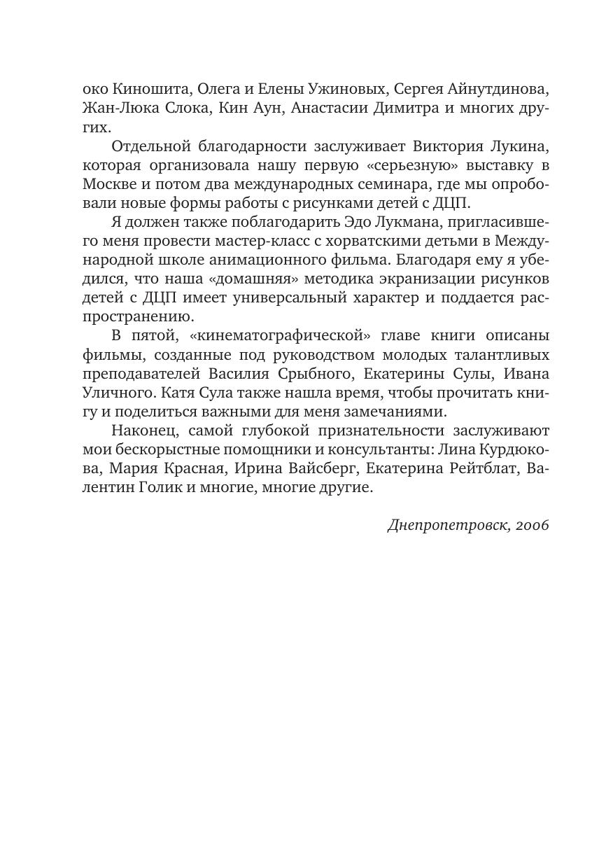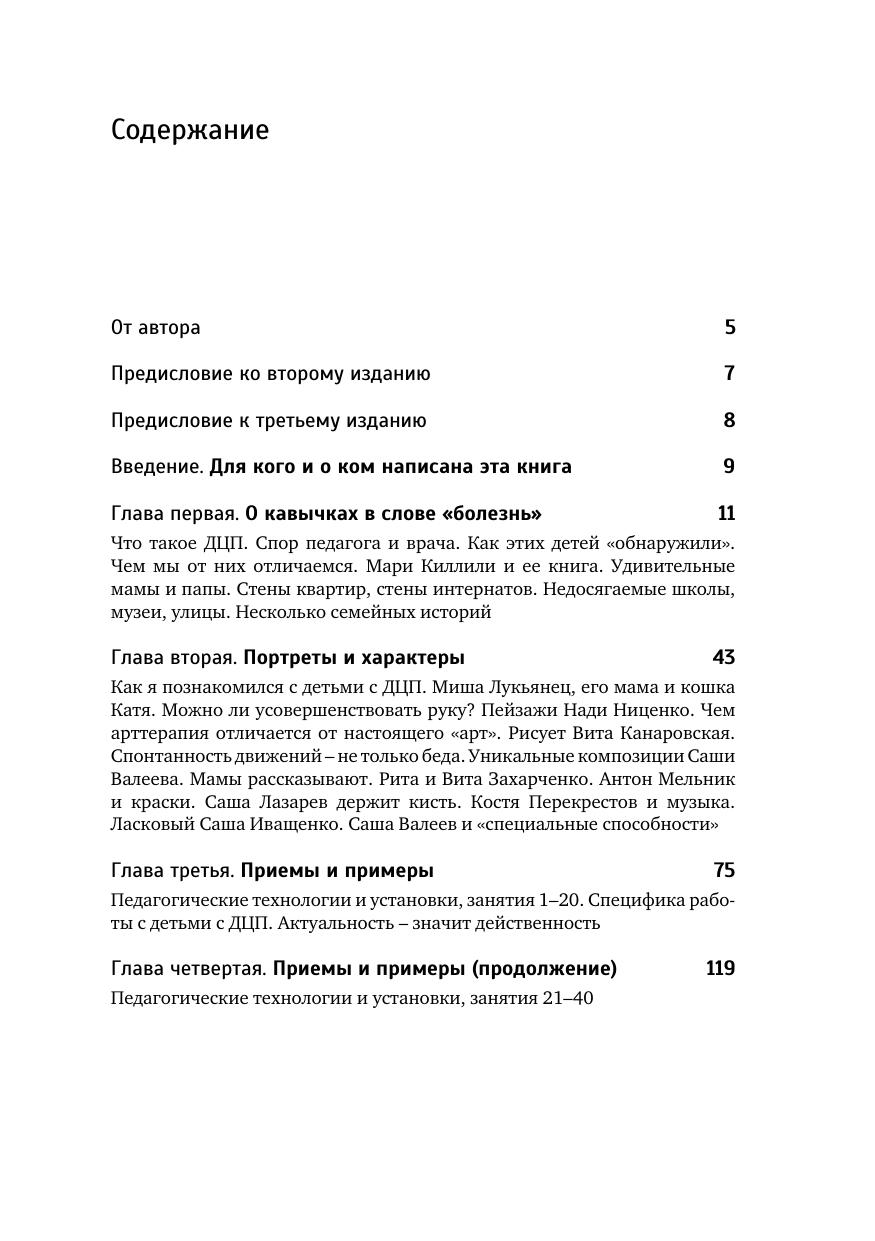 В книге описан многолетний эксперимент по преподаванию искусства детям с церебральным параличом и другими нарушениями психофизического развития. Автор пытается выйти за пределы узкотерапевтических задач, обосновать социальную ценность детей с ДЦП, связанную с особенностями их художественного творчества. Значительная часть книги посвящена подробному описанию приемов и форм творческих занятий с детьми с ДЦП с использованием различных материалов и техник. Уникальным является обращение для реабилитации и социальной адаптации к анимационному творчеству, которое создает исключительные условия для сотрудничества детей с ДЦП со здоровыми детьми.