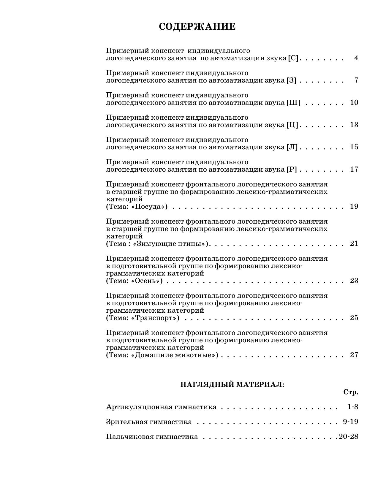 К наглядному материалу даны примерные конспекты индивидуальных логопедических занятий по автоматизации произнесения трудных звуков русского языка: [С], [3], [ш], [ц], [л], [P], а также примерные конспекты логопедических занятий в старшей и подготовительной группе по формированию лексико-грамматических категорий по темам: «Посуда», «Зимующие птицы», «Осень», «Транспорт и Домашние животные».