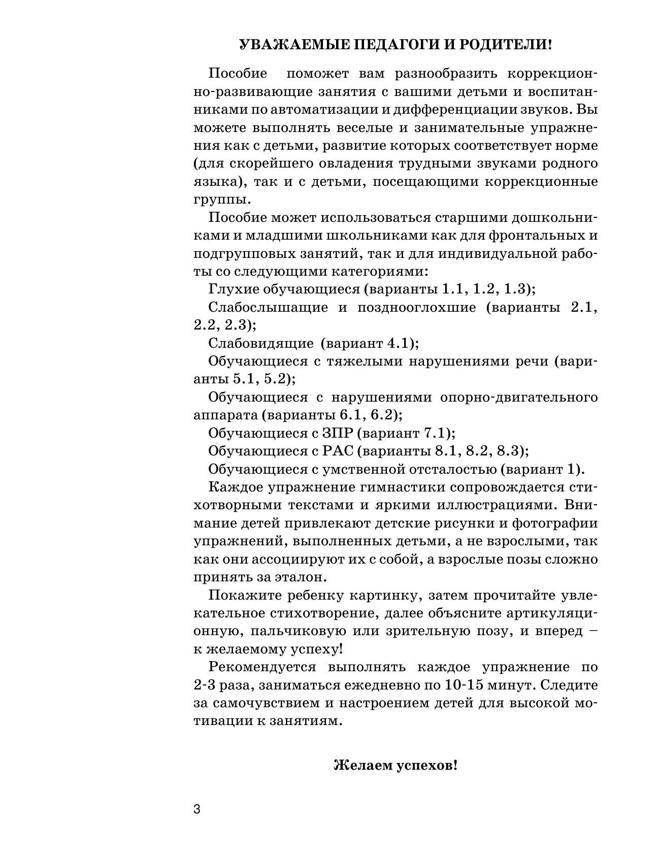 Представлен наглядный материал для проведения артикуляционной, зрительной и пальчиковой гимнастики со старшими дошкольниками и младшими школьниками следующих категорий: глухие обучающиеся (варианты 1.1, 1.2, 1.3); слабослышащие и позднооглохшие (варианты 2.1, 2.2, 2.3); слабовидящие (вариант 4.1); обучающиеся с тяжелыми нарушениями речи (варианты 5.1, 5.2); обучающиеся с нарушениями опорнодвигательного аппарата (варианты 6.1, 6.2); обучающиеся с ЗПР (вариант 7.1); обучающиеся cPAC (варианты 8.1, 8.2, 8.3); обучающиеся с умственной отсталостью (вариант 1).