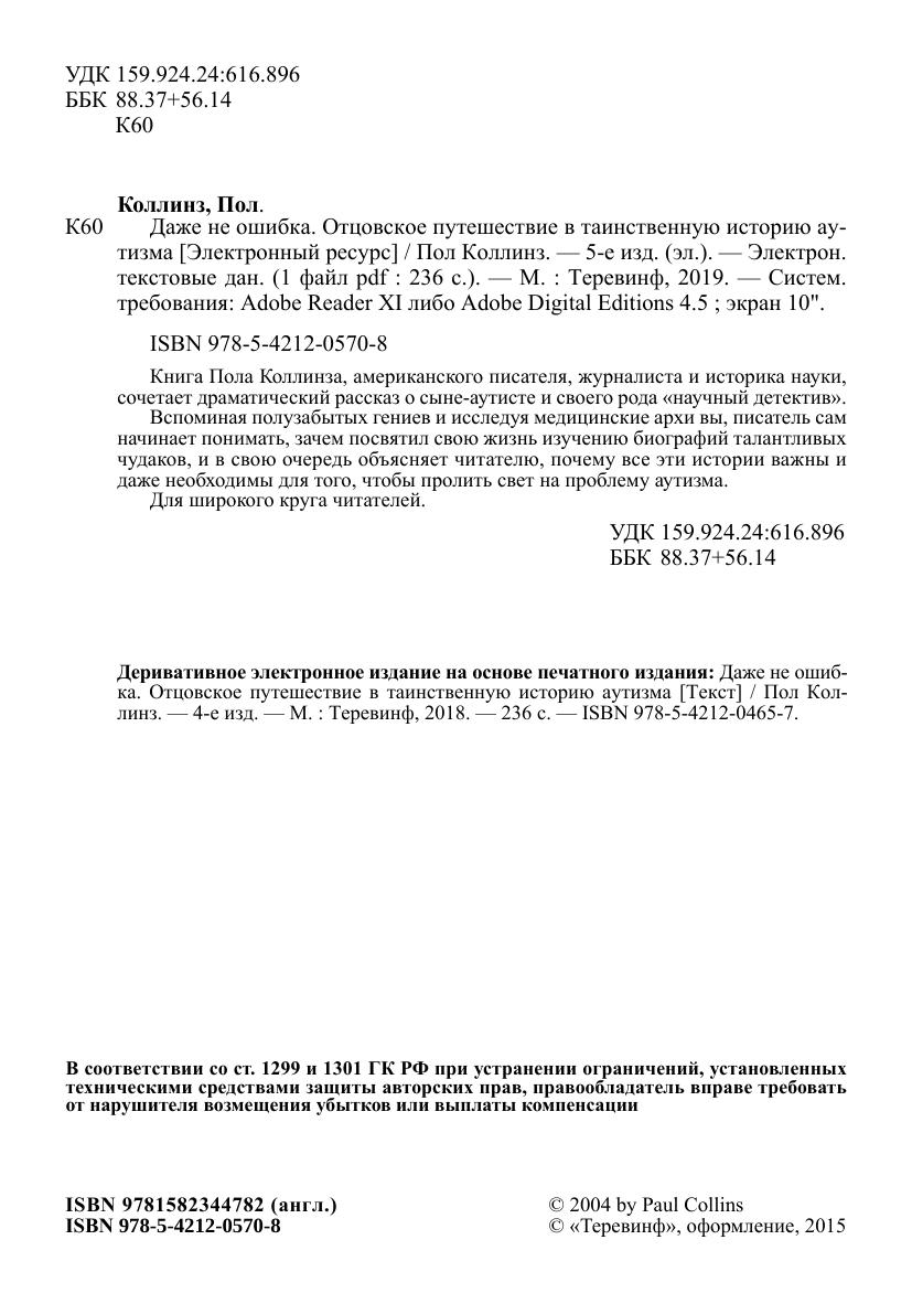 Книга Пола Коллинза, американского писателя, журналиста и историка науки, сочетает драматический рассказ о сыне-аутисте и своего рода «научный детектив». Вспоминая полузабытых гениев и исследуя медицинские архи вы, писатель сам начинает понимать, зачем посвятил свою жизнь изучению биографий талантливых чудаков, и в свою очередь объясняет читателю, почему все эти истории важны и даже необходимы для того, чтобы пролить свет на проблему аутизма.