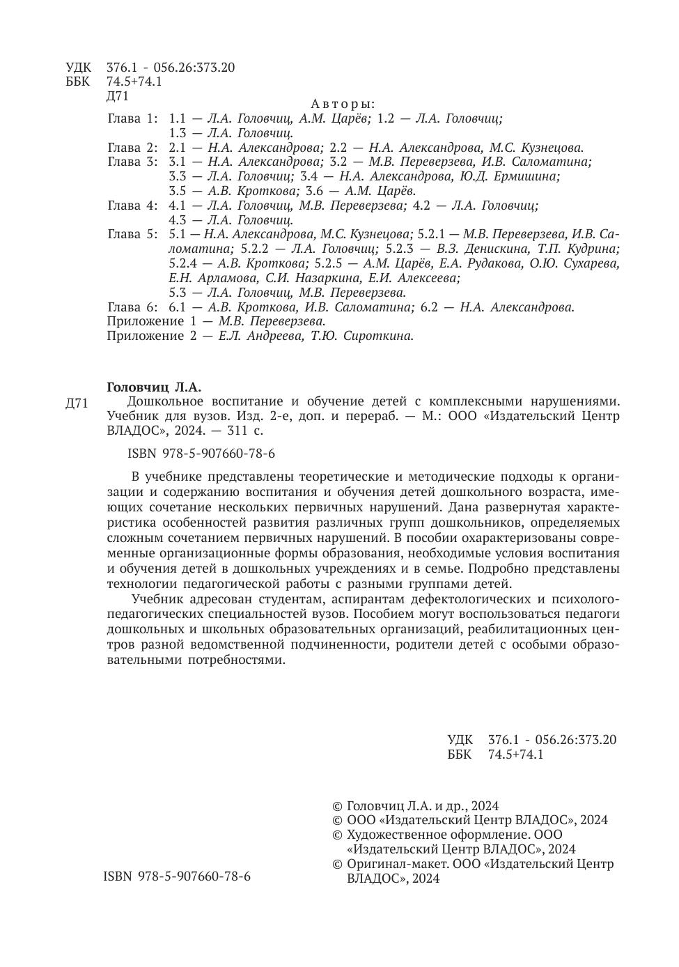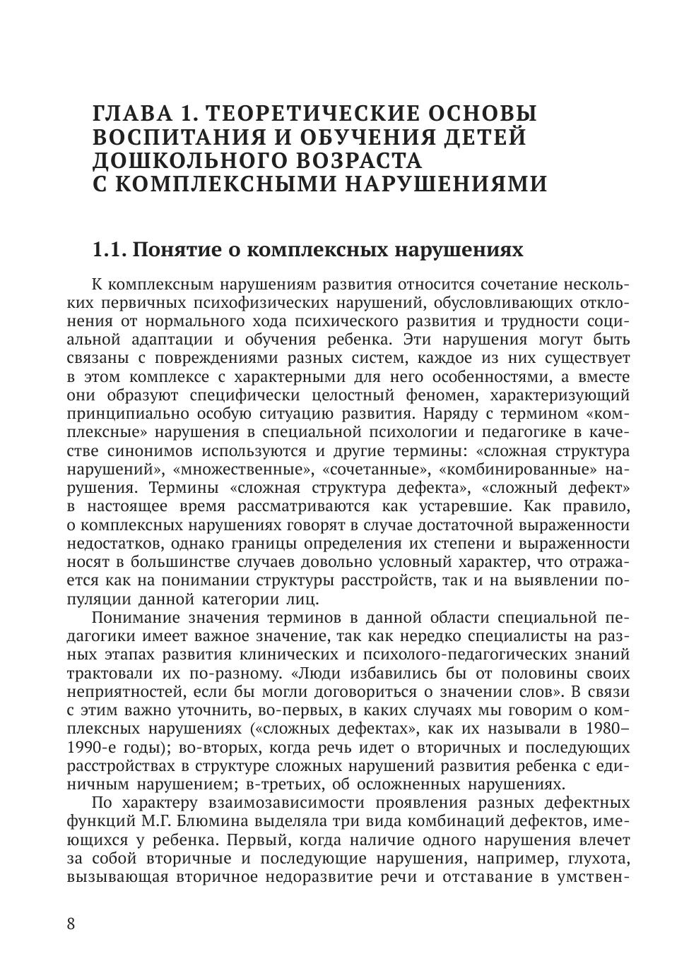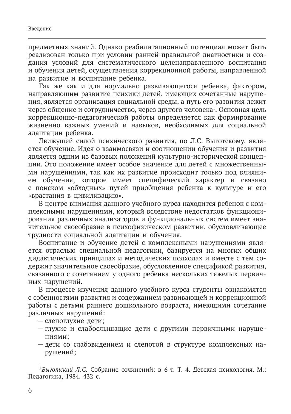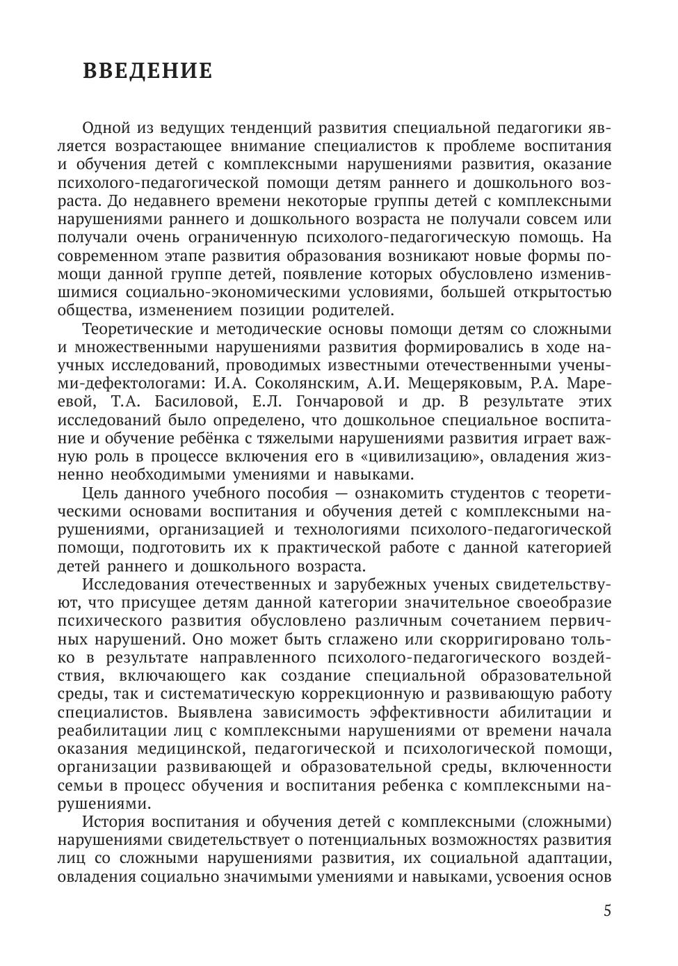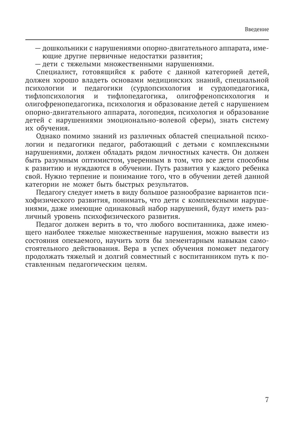В учебнике представлены теоретические и методические подходы к организации и содержанию воспитания и обучения детей дошкольного возраста, имеющих сочетание нескольких первичных нарушений. Дана развернутая характеристика особенностей развития различных групп дошкольников, определяемых сложным сочетанием первичных нарушений. В пособии охарактеризованы современные организационные формы образования, необходимые условия воспитания и обучения детей в дошкольных учреждениях и в семье. Подробно представлены технологии педагогической работы с разными группами детей. Учебник адресован студентам, аспирантам дефектологических и психологопедагогических специальностей вузов. Пособием могут воспользоваться педагоги дошкольных и школьных образовательных организаций, реабилитационных центров разной ведомственной подчиненности, родители детей с особыми образовательными потребностями.
