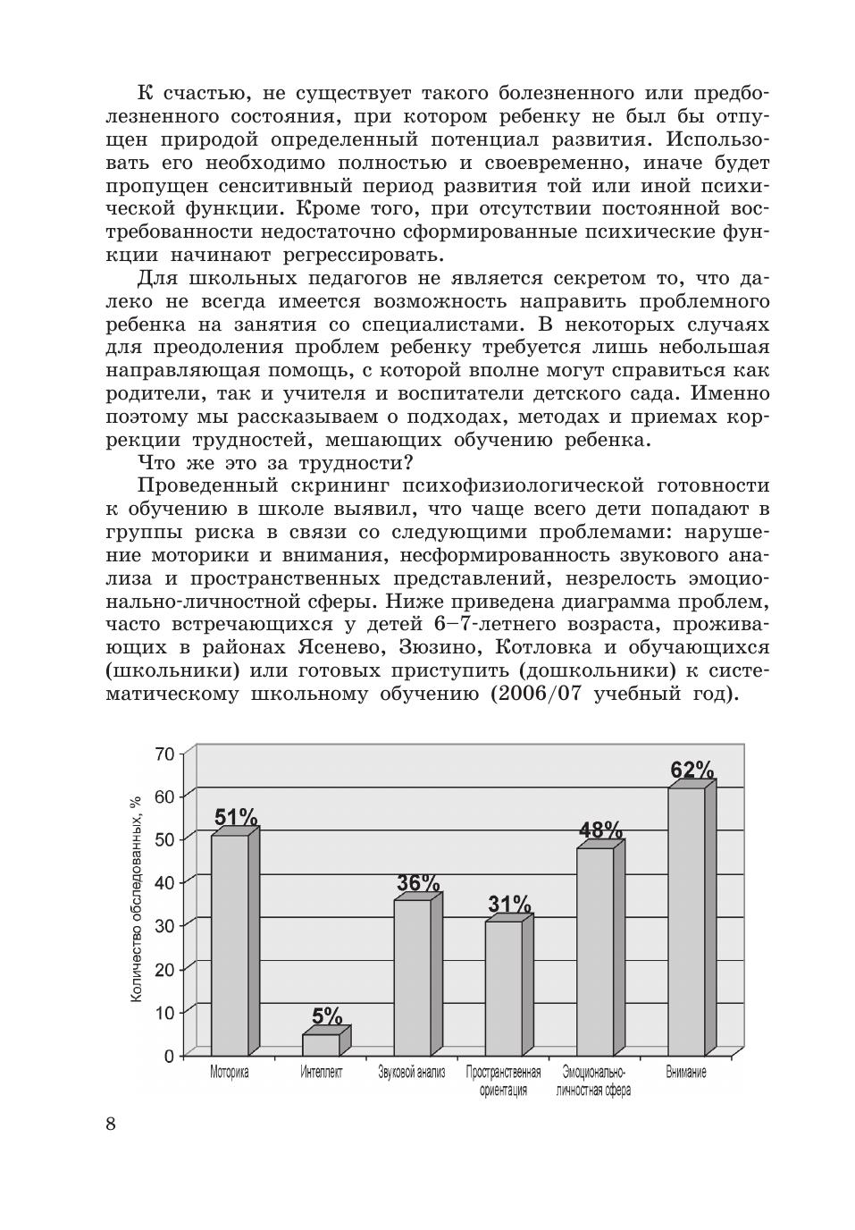 В стенах школы ребенок проведет более 10 лет. Какими они будут — мучительными или радостными? Как ребенок сумеет «встроиться» в систему отношений в классе, приспособиться к порой неясным для него требованиям учителя? Как помочь ребенку стать хорошим учеником, знающим, что такое «хороший ученик», и умеющим учиться? В методическом пособии предлагаются основные образовательно-воспитательные подходы к детям, нуждающимся в психолого-педагогической поддержке, методы и приемы коррекции трудностей в сфере представлений ребенка о пространстве, моторно-перцептивных действий, внимания, памяти, речи, мышления. Представленные в книге игры и упражнения могут быть использованы для индивидуальной работы с ребенком и в качестве заданий для домашней работы. Пособие адресовано учителям первых классов общеобразовательных школ, воспитателям детских садов, школьным психологам и методистам.