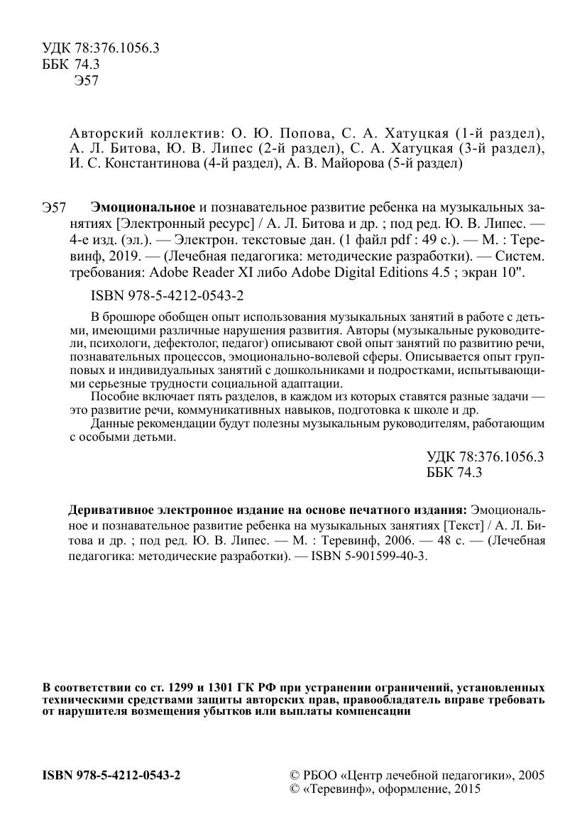 В брошюре обобщен опыт использования музыкальных занятий в работе с детьми, имеющими различные нарушения развития. Авторы (музыкальные руководители, психологи, дефектолог, педагог) описывают свой опыт занятий по развитию речи, познавательных процессов, эмоционально-волевой сферы. Описывается опыт групповых и индивидуальных занятий с дошкольниками и подростками, испытывающими серьезные трудности социальной адаптации.