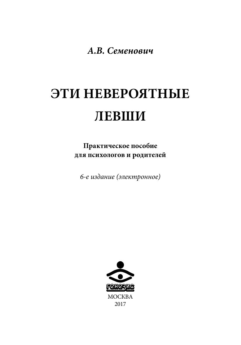 Книга написана известным нейропсихологом, автором учебников, монографий и практических пособий по общей нейропсихологии и нейропсихологии детского возраста. Она адресована психологам, педагогам, логопедам, дефектологам, родителям и всем, кого волнуют проблемы детей-левшей.