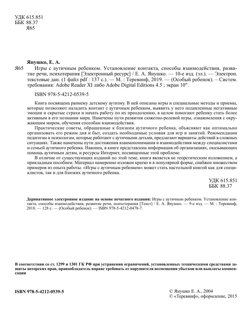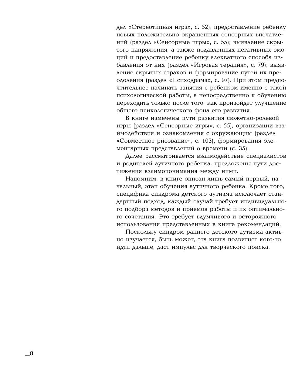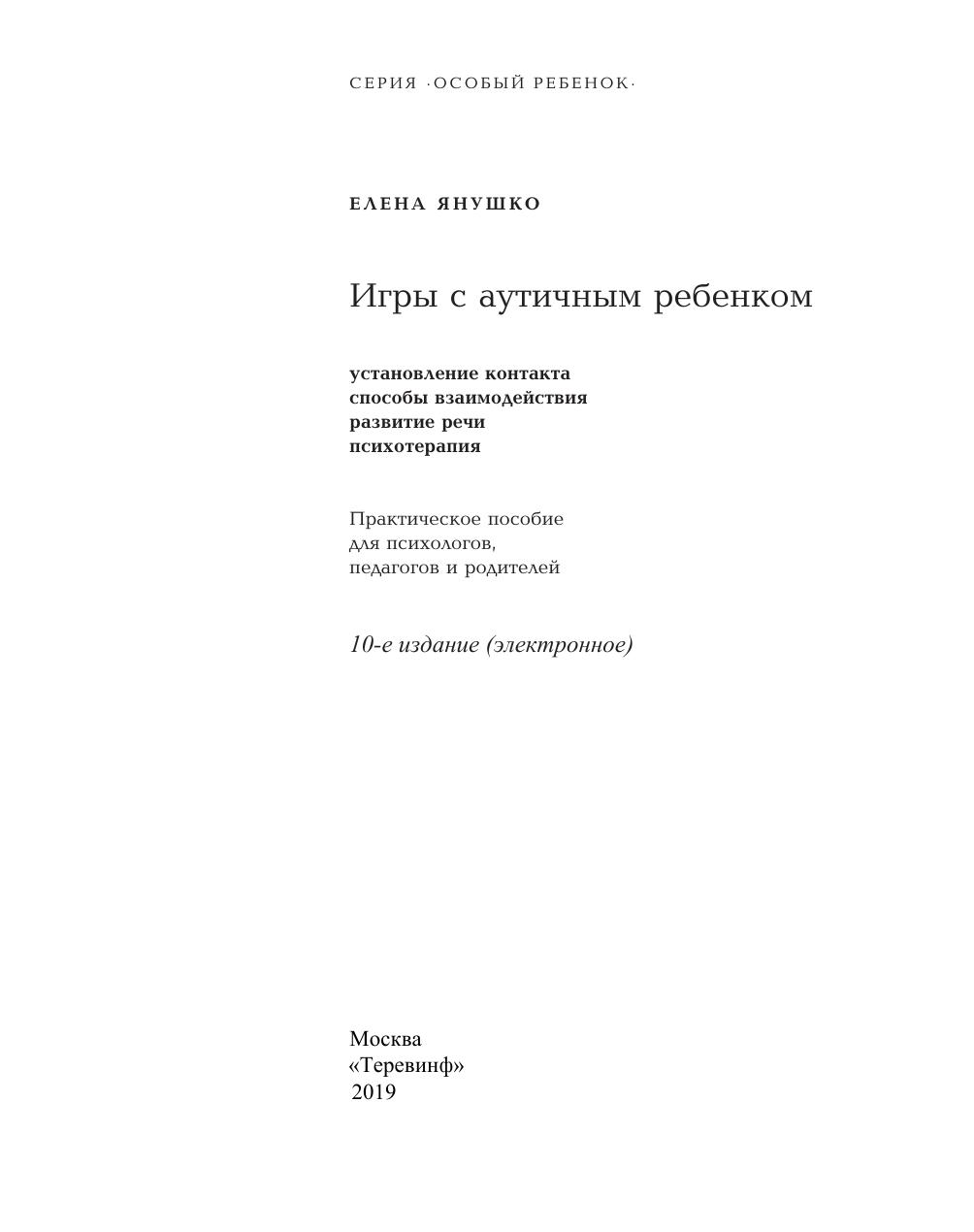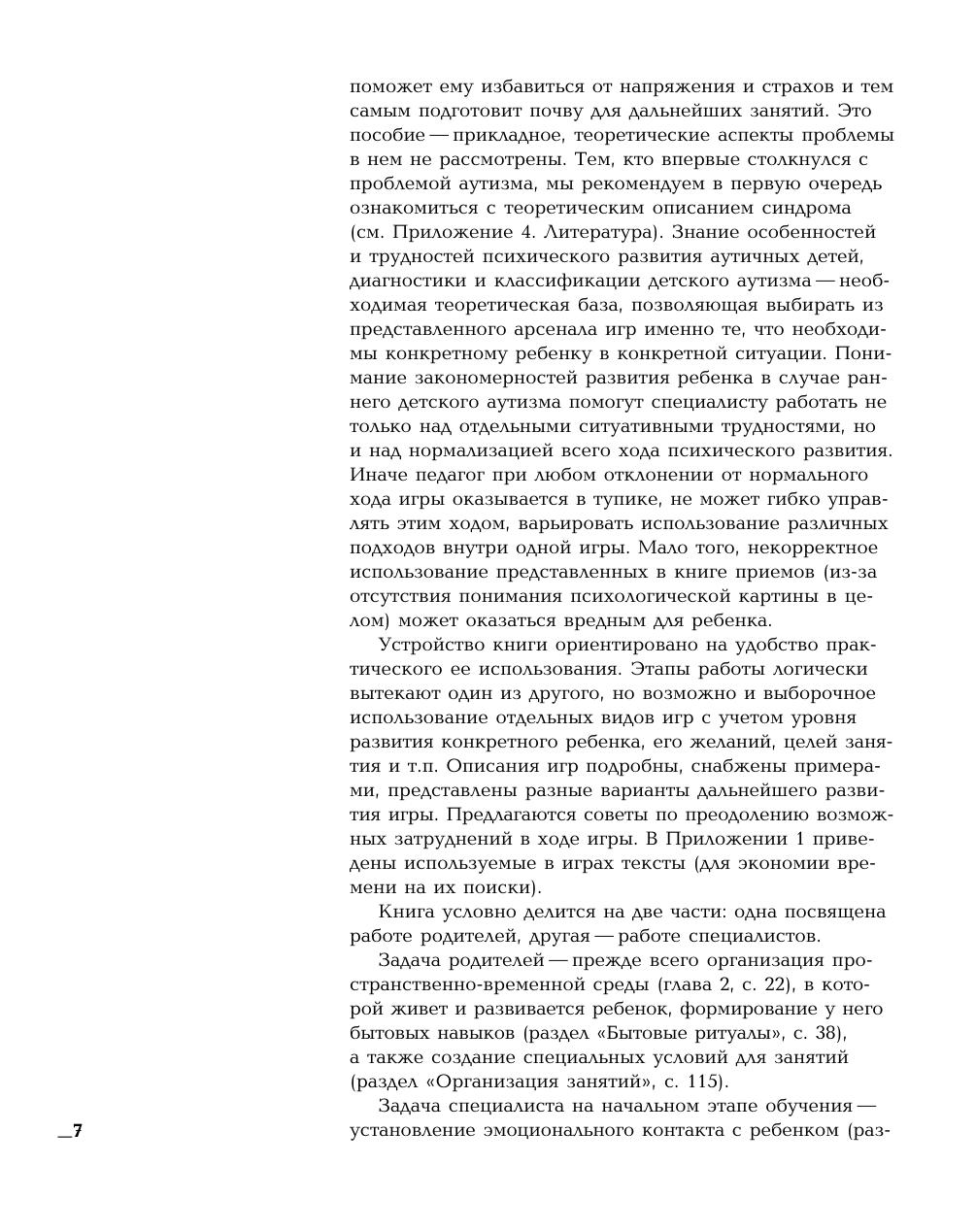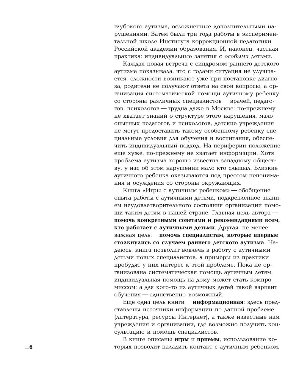 помощь аутичным детям, и ресурсы Интернет, посвященные этой проблеме. В отличие от существующих изданий по этой теме, книга является не теоретическим изложением, а прикладным пособием. Материал намеренно изложен кратко и в популярной форме, снабжен множеством примеров из опыта работы. «Игры с аутичным ребенком» может стать настольной книгой как для специалистов, так и для близких аутичного ребенка.