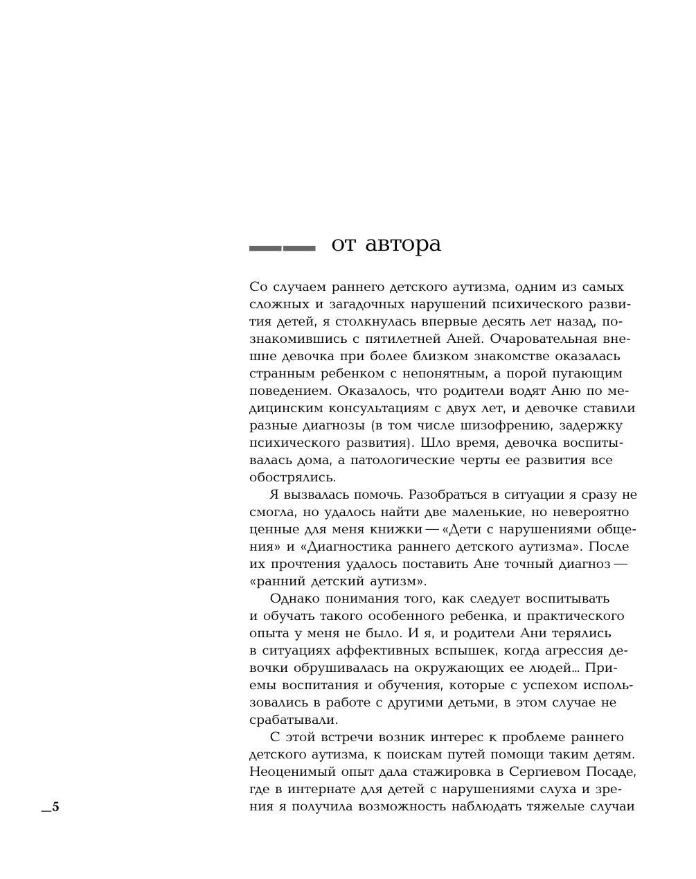 Книга посвящена раннему детскому аутизму. В ней описаны игры и специальные методы и приемы, которые позволяют наладить контакт с аутичным ребенком, выявить у него подавленные негативные эмоции и скрытые страхи и начать работу по их преодолению, в целом помогают ребенку стать более активным в его познании мира. Намечены пути развития сюжетно-ролевой игры, ознакомления с окружающим миром, обучения способам взаимодействия. Практические советы, обращенные к близким аутичного ребенка, объясняют как оптимально организовать его режим дня и быт, создать необходимые условия для игр и занятий. Рекомендации педагогам и психологам, которые работают с аутичными детьми, предлагают варианты действий в сложных ситуациях. Также намечены пути достижения взаимопонимания и взаимодействия между специалистами и семьей аутичного ребенка. Наконец, в книге представлена информация об организациях, оказывающих