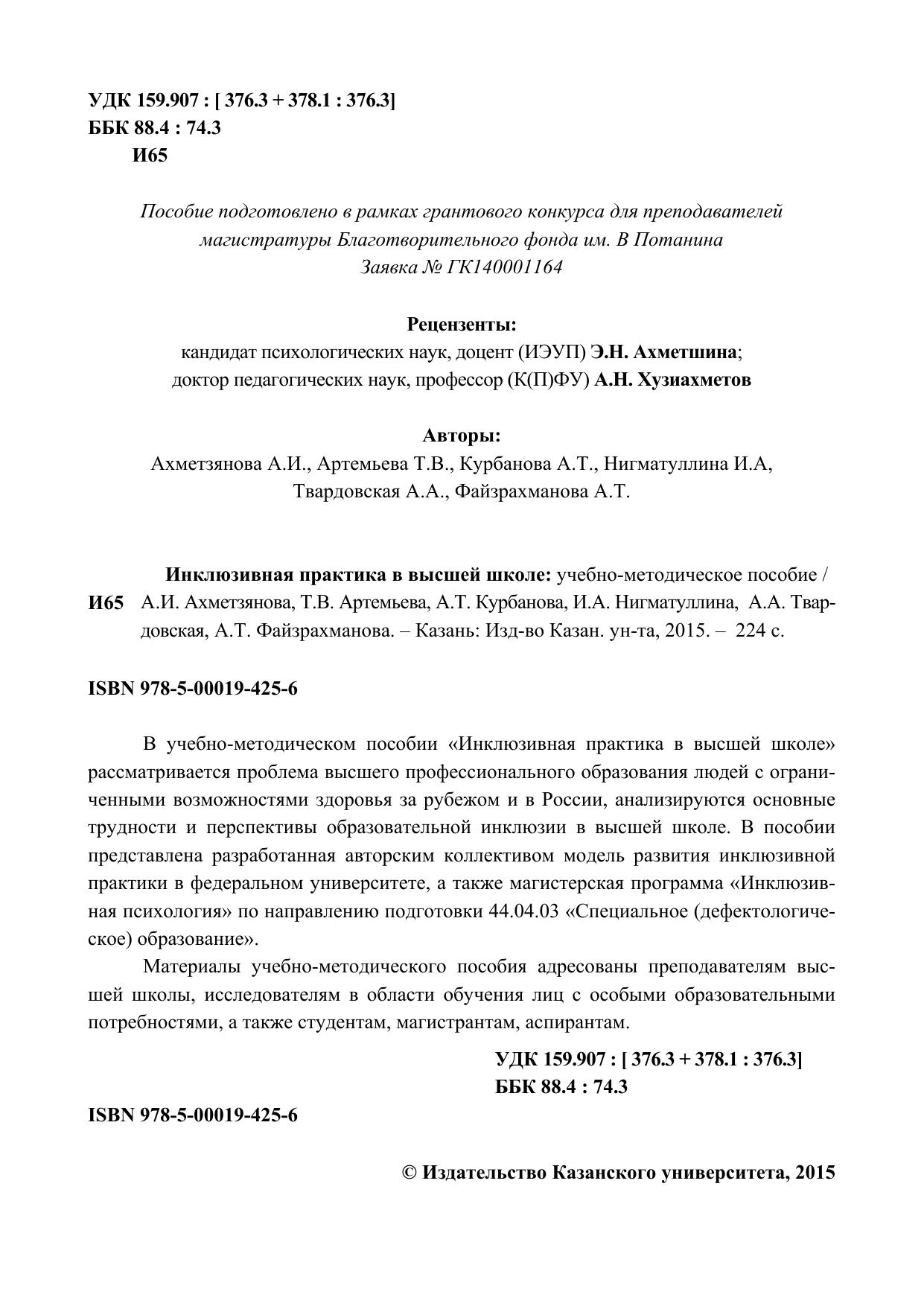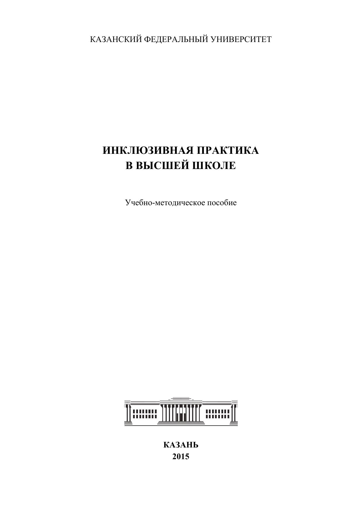 В учебно-методическом пособии «Инклюзивная практика в высшей школе» рассматривается проблема высшего профессионального образования людей с ограниченными возможностями здоровья за рубежом и в России, анализируются основные трудности и перспективы образовательной инклюзии в высшей школе. В пособии представлена разработанная авторским коллективом модель развития инклюзивной практики в федеральном университете, а также магистерская программа «Инклюзивная психология» по направлению подготовки 44.04.03 «Специальное (дефектологическое) образование». Материалы учебно-методического пособия адресованы преподавателям высшей школы, исследователям в области обучения лиц с особыми образовательными потребностями, а также студентам, магистрантам, аспирантам.