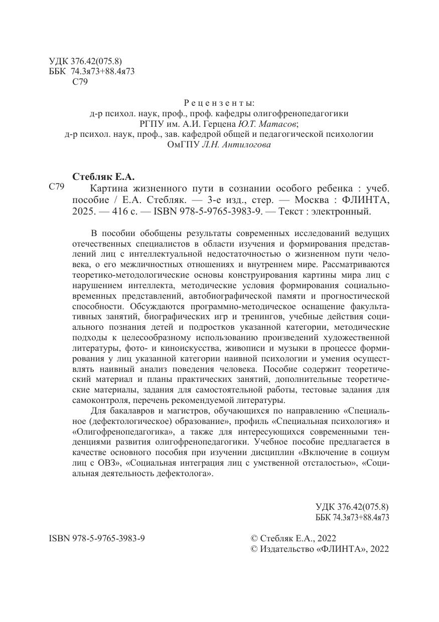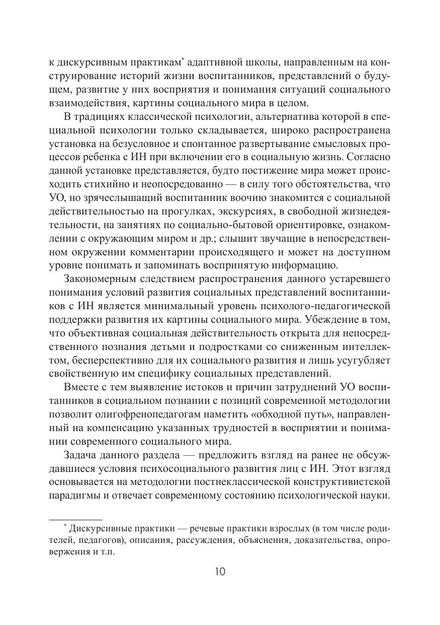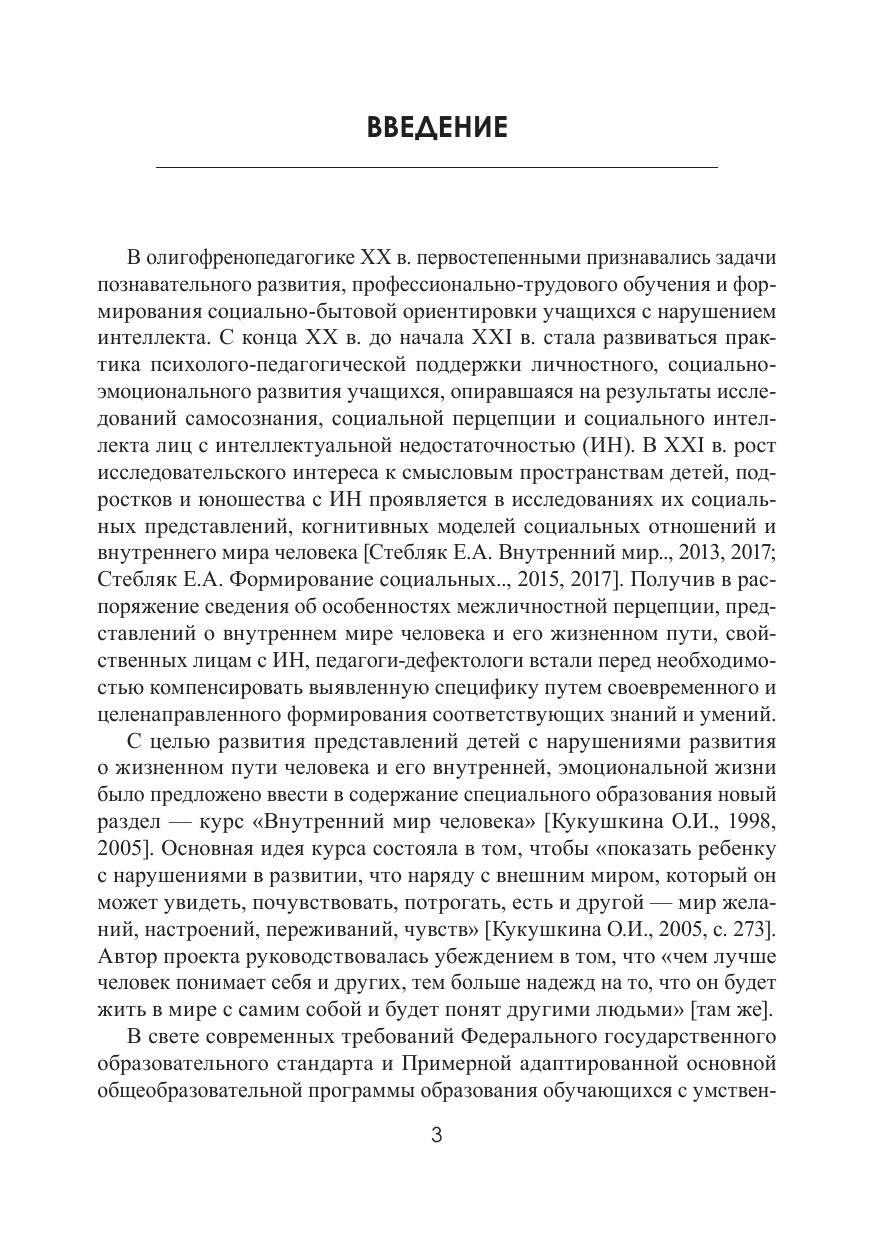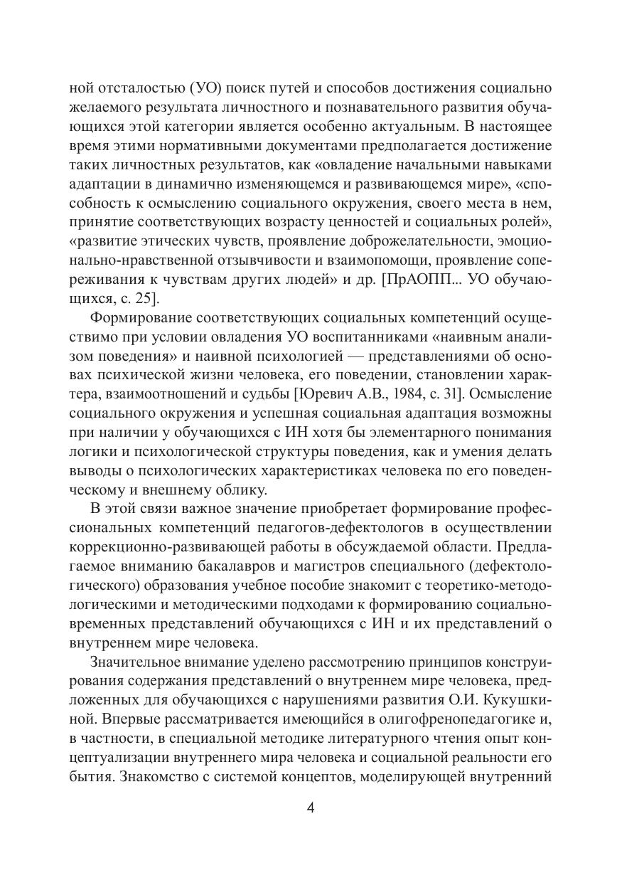 В пособии обобщены результаты современных исследований ведущих отечественных специалистов в области изучения и формирования представлений лиц с интеллектуальной недостаточностью о жизненном пути человека, о его межличностных отношениях и внутреннем мире. Рассматриваются теоретико-методологические основы конструирования картины мира лиц с нарушением интеллекта, методические условия формирования социальновременных представлений, автобиографической памяти и прогностической способности. Обсуждаются программно-методическое оснащение факультативных занятий, биографических игр и тренингов, учебные действия социального познания детей и подростков указанной категории, методические подходы к целесообразному использованию произведений художественной литературы, фото- и киноискусства, живописи и музыки в процессе формирования у лиц указанной категории наивной психологии и умения осуществлять наивный анализ поведения человека. Пособие содержит теоретический материал и планы практических занятий, дополнительные теоретические материалы, задания для самостоятельной работы, тестовые задания для самоконтроля, перечень рекомендуемой литературы. Для бакалавров и магистров, обучающихся по направлению «Специальное (дефектологическое) образование», профиль «Специальная психология» и «Олигофренопедагогика», а также для интересующихся современными тенденциями развития олигофренопедагогики. Учебное пособие предлагается в качестве основного пособия при изучении дисциплин «Включение в социум лиц с ОВЗ», «Социальная интеграция лиц с умственной отсталостью», «Социальная деятельность дефектолога».