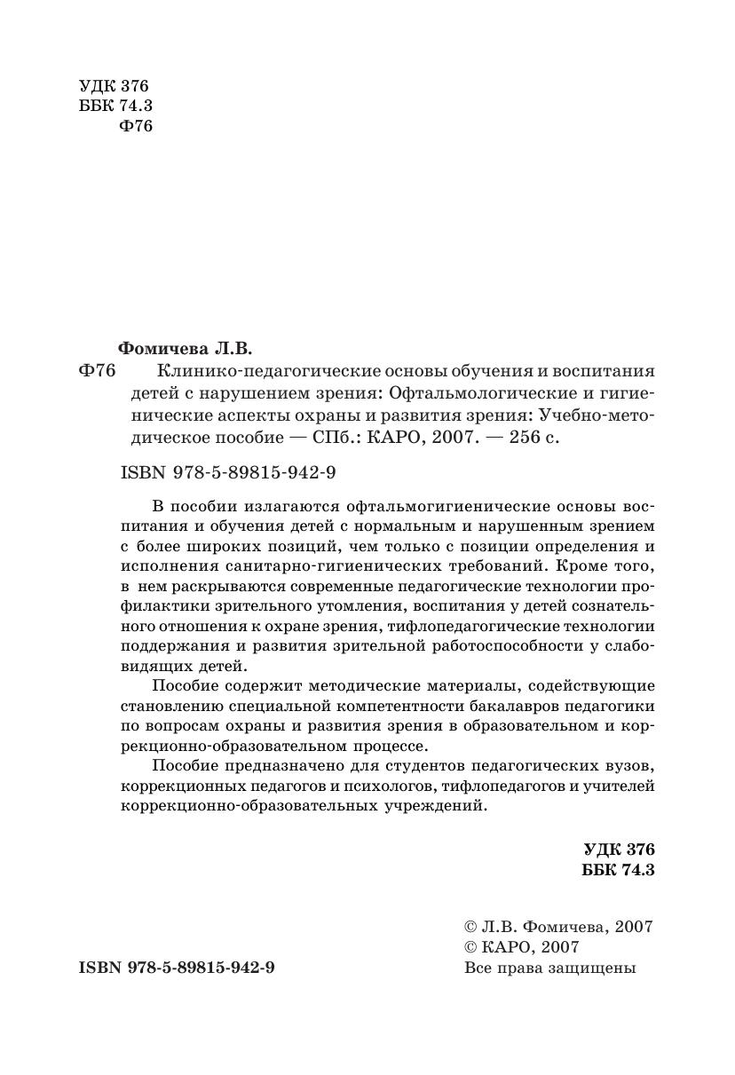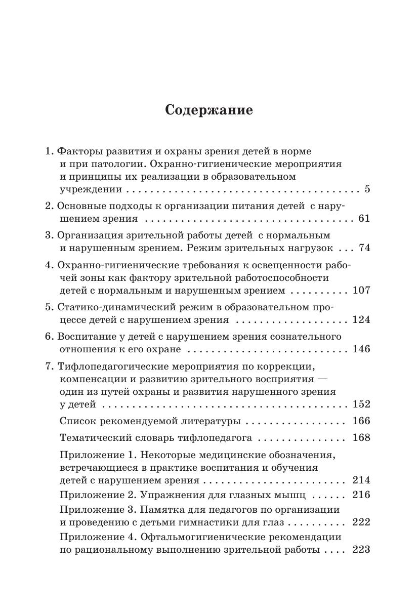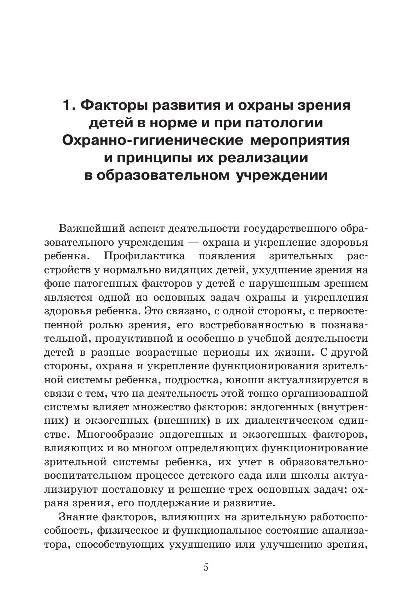 В пособии излагаются офтальмогигиенические основы воспитания и обучения детей с нормальным и нарушенным зрением с более широких позиций, чем только с позиции определения и исполнения санитарно-гигиенических требований. Кроме того, в нем раскрываются современные педагогические технологии профилактики зрительного утомления, воспитания у детей сознательного отношения к охране зрения, тифлопедагогические технологии поддержания и развития зрительной работоспособности у слабо видящих детей. Пособие содержит методические материалы, содействующие становлению специальной компетентности бакалавров педагогики по вопросам охраны и развития зрения в образовательном и коррекционно-образовательном процессе. Пособие предназначено для студентов педагогических вузов, коррекционных педагогов и психологов, тифлопедагогов и учителей коррекционно-образовательных учреждений.