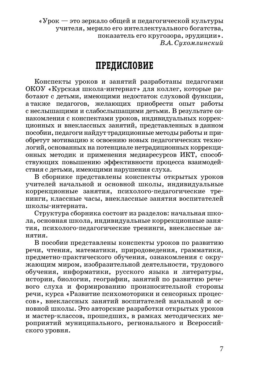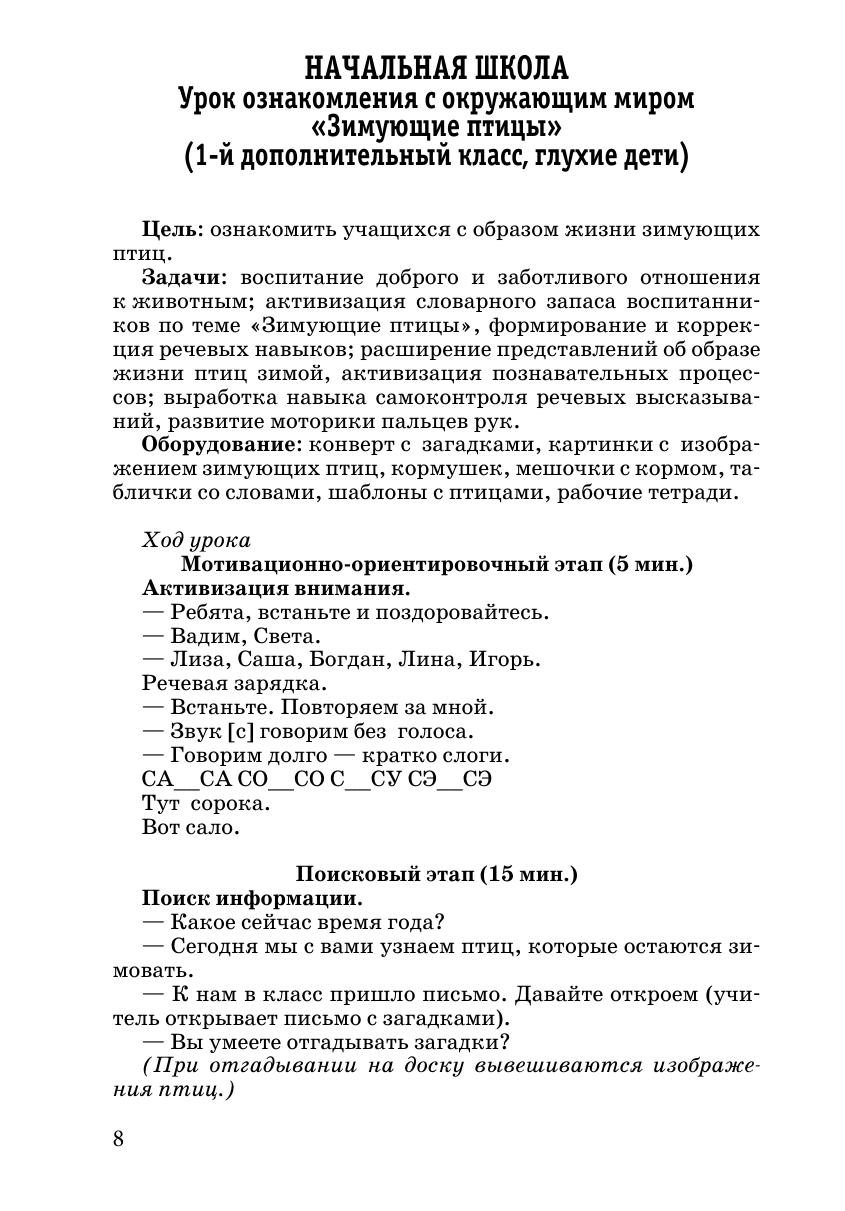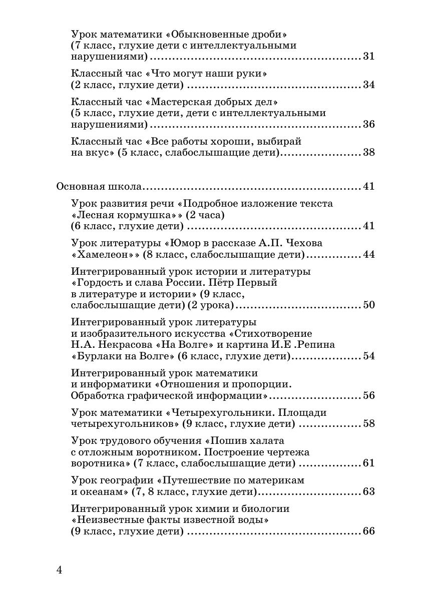 В сборнике представлены конспекты открытых уроков для начальной и основной школы по развитию речи, чтению, математики, природоведения, грамматики, предметно-практического обучения, ознакомления с окружающим миром, изобразительной деятельности, трудового обучения, информатики, русского языка и литературы, истории, биологии, географии, занятий по развитию речевого слуха и формированию произносительной стороны речи. В сборник включены также индивидуальные коррекционные занятия, психолого-педагогические тренинги, классные часы, вне классные занятия воспитателей школы-интерната.