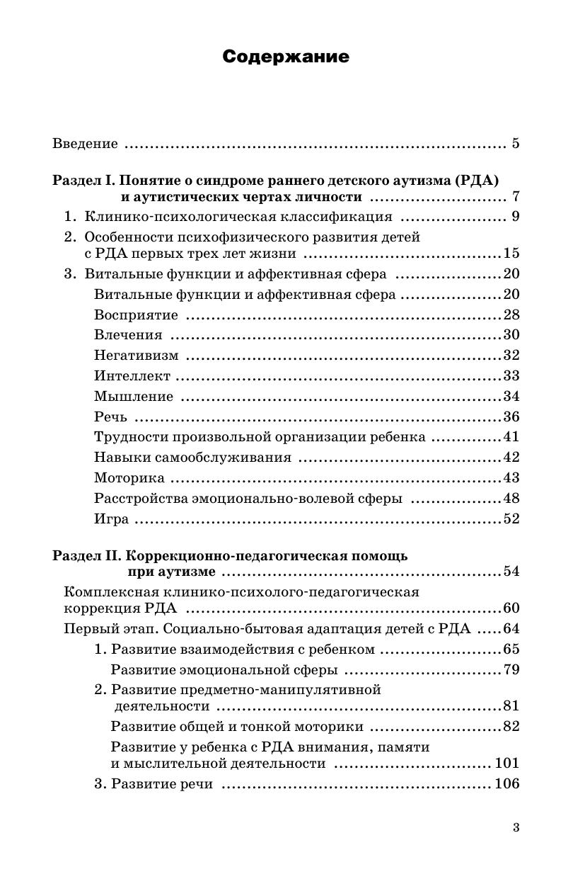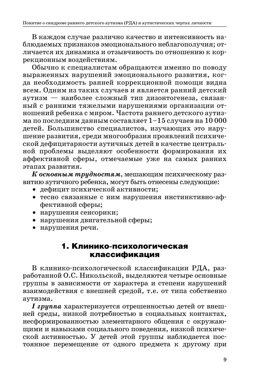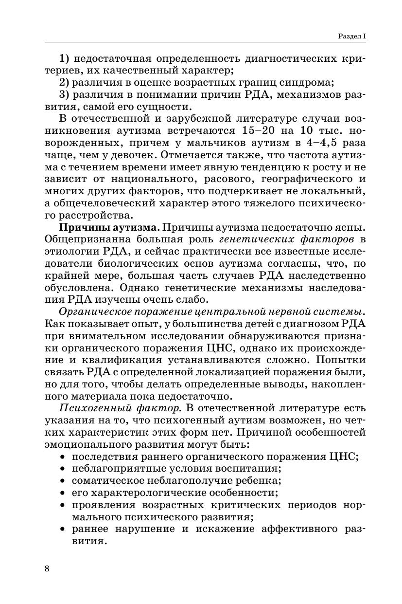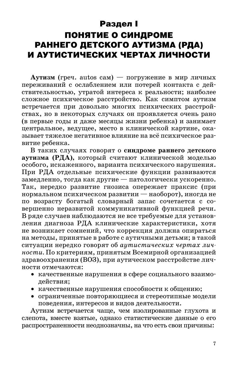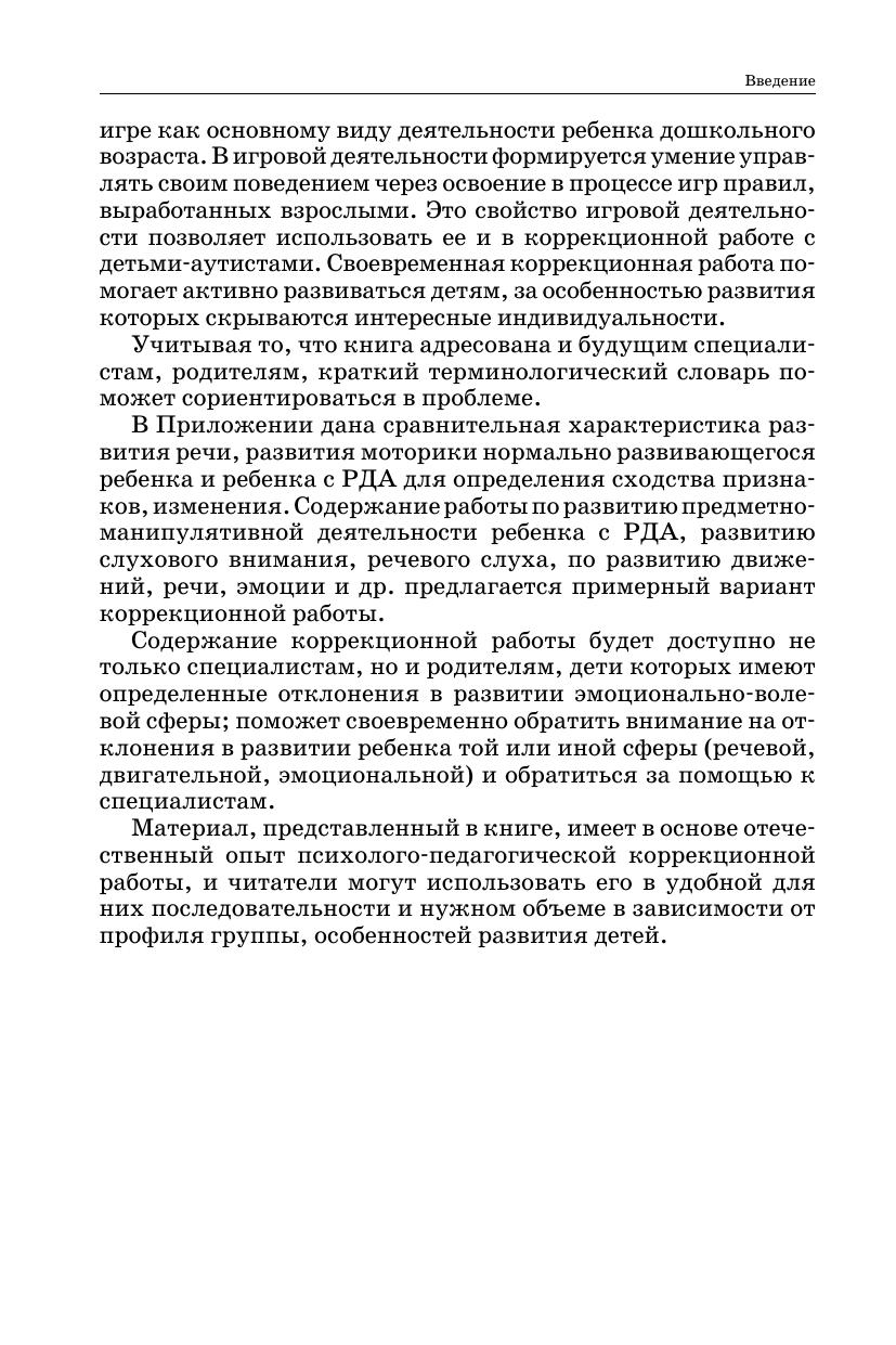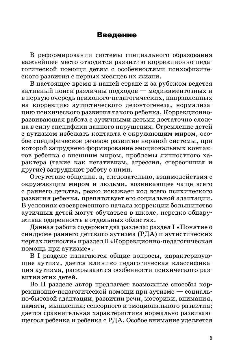 В пособии раскрывается одна из наиболее важных проблем в отклонениях развития — аутизм. Представлена информация об особенностях психического развития детей с ранним аутизмом, клинико-психологической классификации, сравнительная характеристика развития моторики, речи нормально развивающегося ребенка и ребенка с РДА, о методах коррекционно-педагогической помощи, диагностике при аутизме. Предложенные методы обследования помогут своевременно выявить у детей нарушения в развитии интеллектуальной, эмоциональной и других сфер и обратиться за консультацией к специалистам. Автор предлагает игры, упражнения, фрагменты занятий, которые можно использовать на разных этапах коррекционной работы учителями-дефектологами, воспитателями, родителями. Книга рассчитана на широкий круг специалистов, которые работают с аутичными детьми, также может быть использована студентами педвузов и средних специальных учебных учреждений, родителями, имеющими детей с диагнозом РДА.