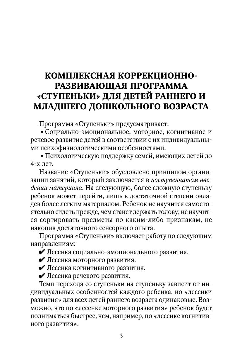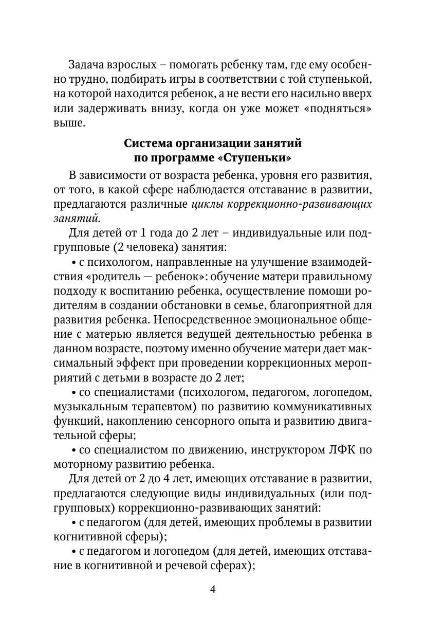 Программа «Ступеньки» предусматривает социально-эмоциональное, умственное, речевое развитие детей раннего возраста в соответствии с их индивидуальными психофизиологическими особенностями, психологическую поддержку семей, имеющих малышей до 4 лет. Программа обеспечивает комплексный подход к решению проблем ребенка.