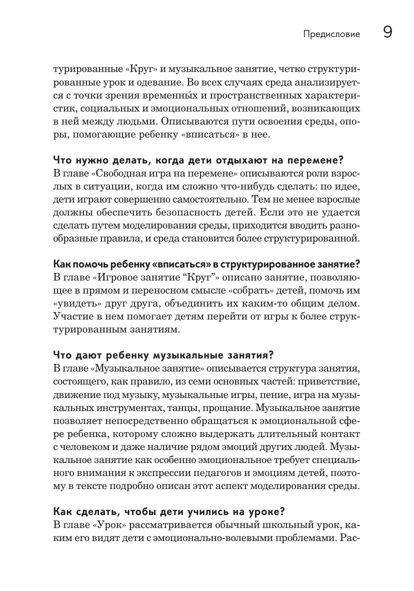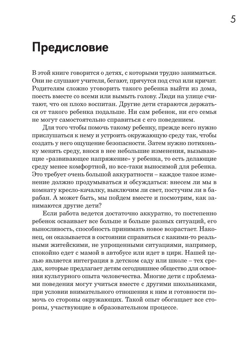 В книге подробно описываются этапы введения детей в группу; рассказывается, из каких занятий складывается день; приводятся общие законы построения занятий, позволяющие шаг за шагом включить ребенка с проблемами поведения в достаточно разнообразные среды — урока, перемены, музыкального занятия и т.д. Большое внимание уделено трудностям, возникающим в процессе работы, и путям их преодоления.