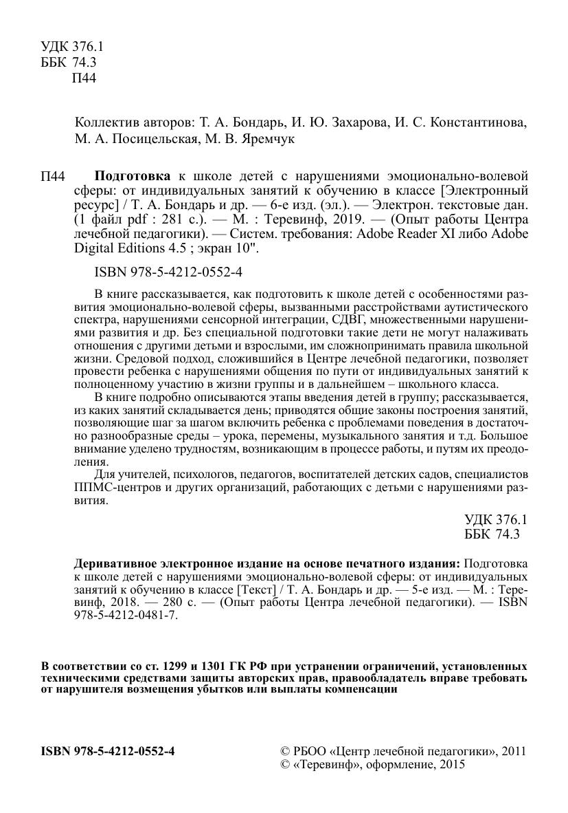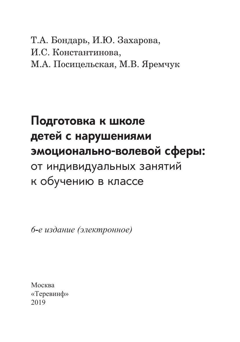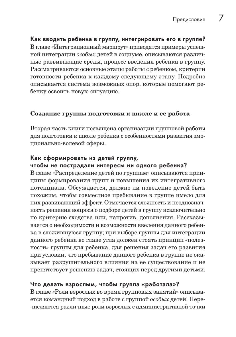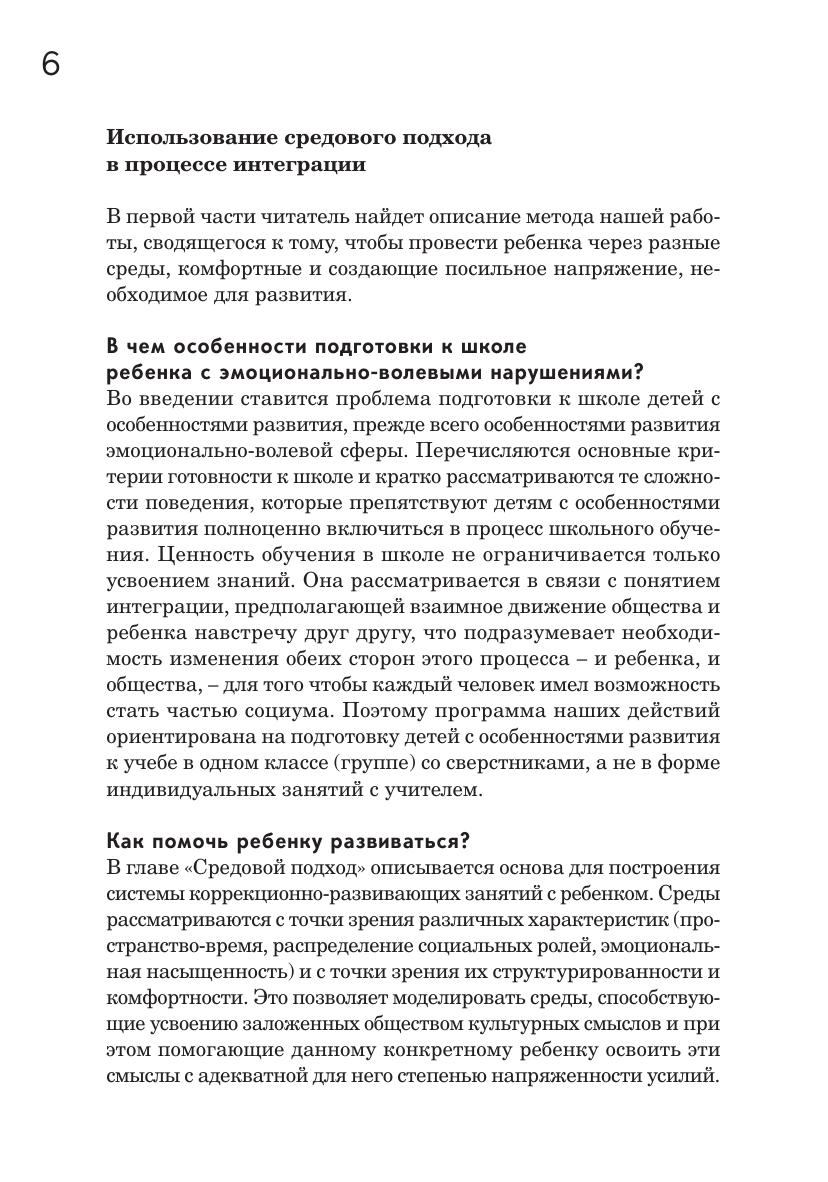 В книге рассказывается, как подготовить к школе детей с особенностями развития эмоционально-волевой сферы, вызванными расстройствами аутистического спектра, нарушениями сенсорной интеграции, СДВГ, множественными нарушениями развития и др. Без специальной подготовки такие дети не могут налаживать отношения с другими детьми и взрослыми, им сложно принимать правила школьной жизни. Средовой подход, сложившийся в Центре лечебной педагогики, позволяет провести ребенка с нарушениями общения по пути от индивидуальных занятий к полноценному участию в жизни группы и в дальнейшем — школьного класса.