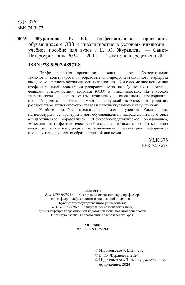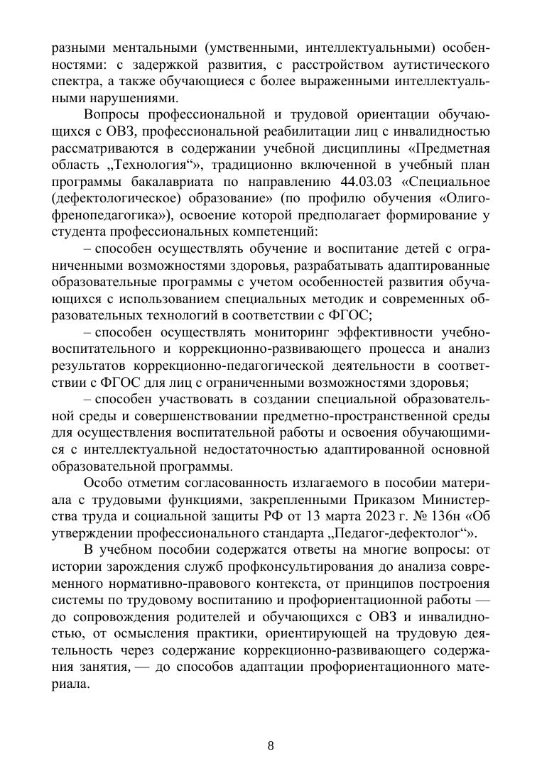 Профессиональная ориентация сегодня - это образовательная технология конструирования образовательно-профориентационного маршрута каждого конкретного обучающегося. В данном пособии современное понимание профессиональной ориентации распространяется на обучающихся с ограниченными возможностями здоровья (ОВЗ) и инвалидностью. На глубокой теоретической основе раскрыты практические особенности профориентационной работы с обучающимися с задержкой психического развития, расстройством аутистического спектра и интеллектуальными нарушениями. Учебное пособие предназначено для студентов бакалавриата, магистратуры и аспирантуры вузов, обучающихся по направлениям подготовки «Педагогическое образование», «Психолого-педагогическое образование», «Специальное (дефектологическое) образование», а также может быть полезно педагогам, психологам, родителям, включенным в реализацию профориентационных задач в условиях образовательной инклюзии.