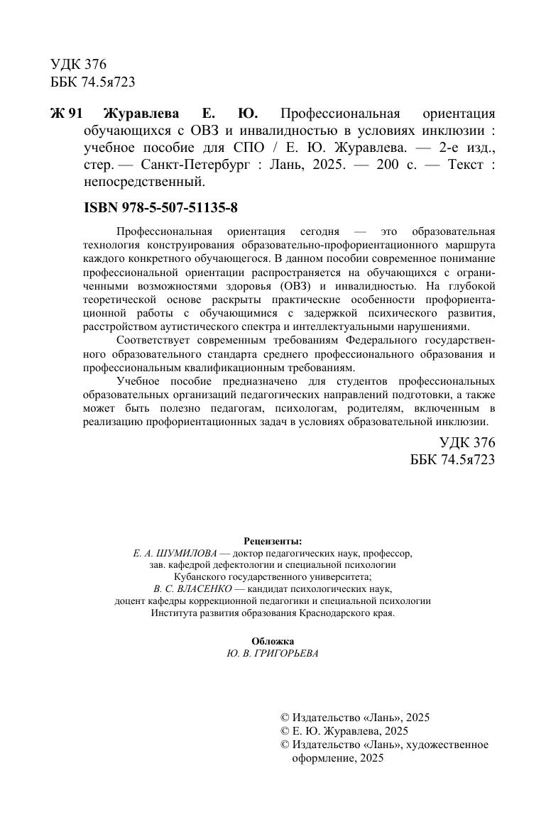 Профессиональная ориентация сегодня — это образовательная технология конструирования образовательно-профориентационного маршрута каждого конкретного обучающегося. В данном пособии современное понимание профессиональной ориентации распространяется на обучающихся с ограниченными возможностями здоровья (ОВЗ) и инвалидностью. На глубокой теоретической основе раскрыты практические особенности профориентационной работы с обучающимися с задержкой психического развития, расстройством аутистического спектра и интеллектуальными нарушениями. Соответствует современным требованиям Федерального государственного образовательного стандарта среднего профессионального образования и профессиональным квалификационным требованиям. Учебное пособие предназначено для студентов профессиональных образовательных организаций педагогических направлений подготовки, а также может быть полезно педагогам, психологам, родителям, включенным в реализацию профориентационных задач в условиях образовательной инклюзии.