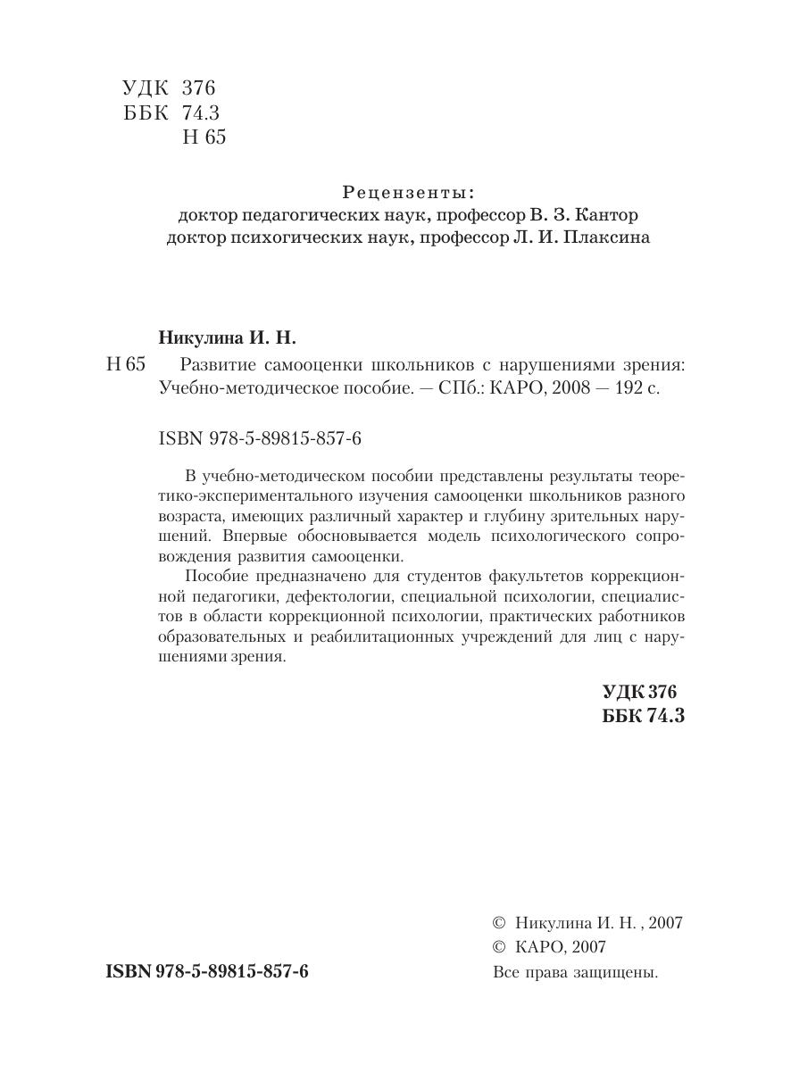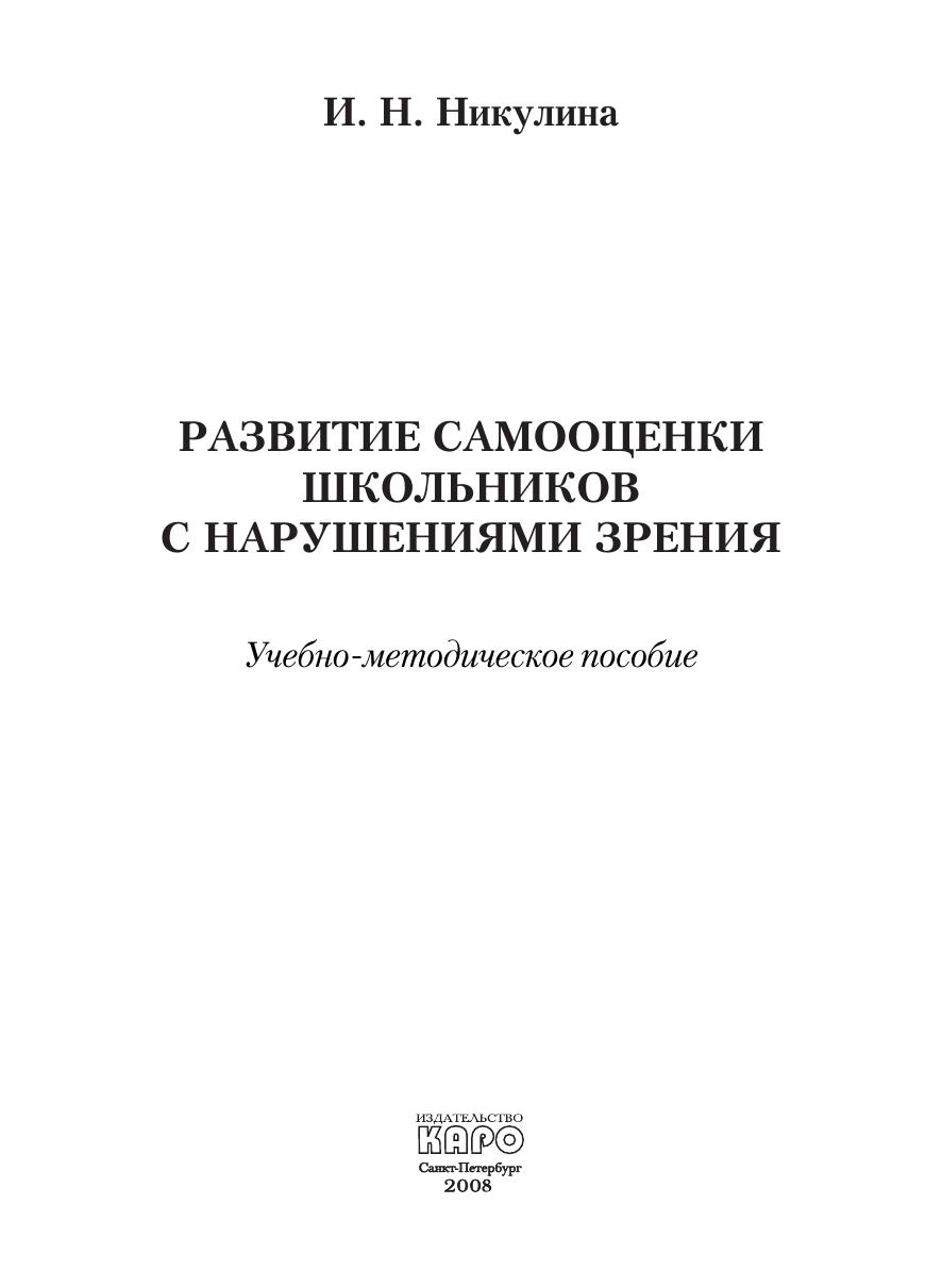 В учебно-методическом пособии представлены результаты теоретико-экспериментального изучения самооценки школьников разного возраста, имеющих различный характер и глубину зрительных нарушений. Впервые обосновывается модель психологического сопровождения развития самооценки.