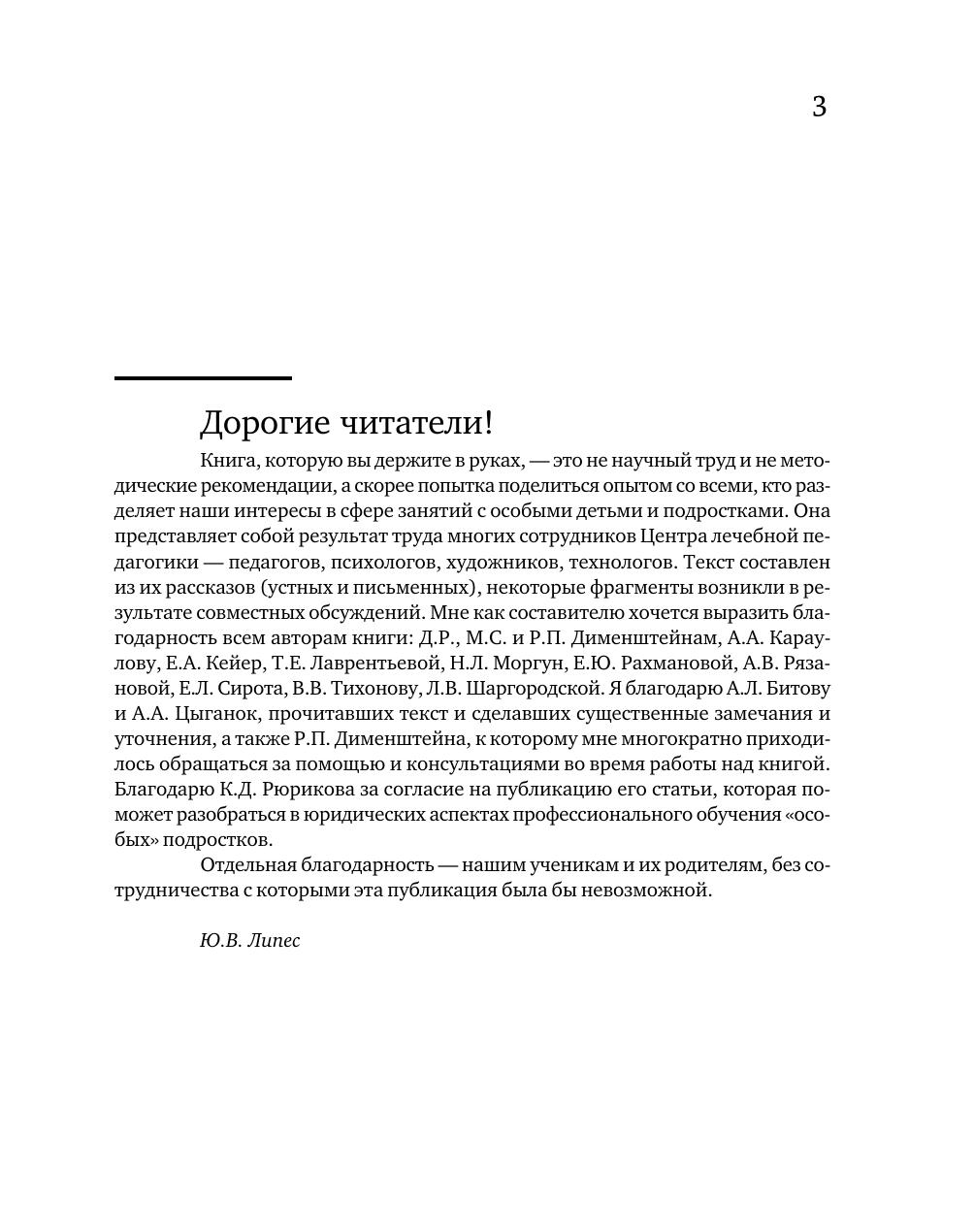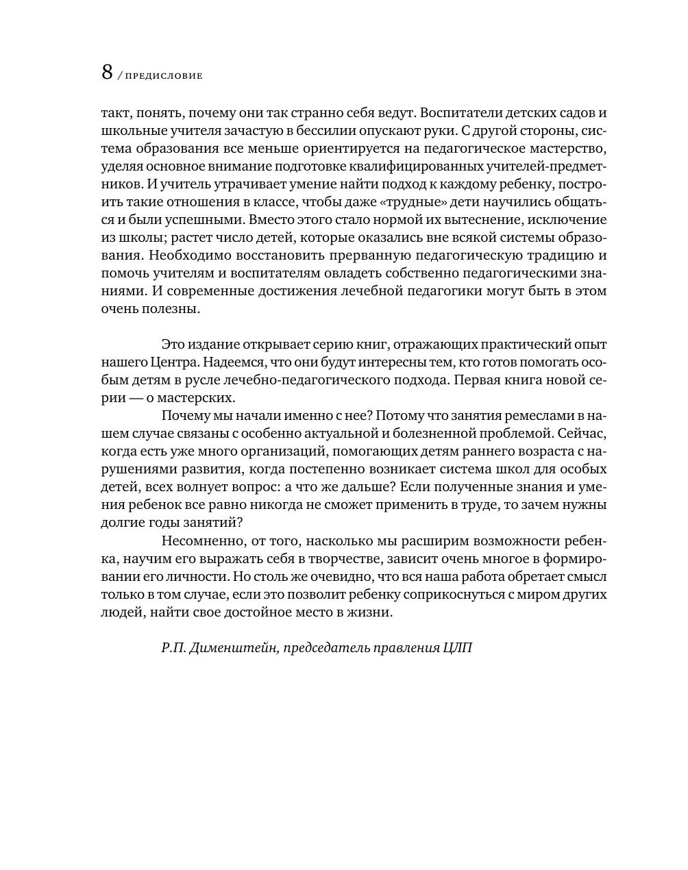 В книге представлен опыт разнообразных занятий ремеслом с особыми детьми и подростками в Центре лечебной педагогики, где уже много лет помогают детям с нарушениями развития. Специалисты рассказывают об организации занятий в терапевтических и предпрофессиональных мастерских, методах решения педагогических и коррекционных задач, теоретических основах этой работы и ее практических результатах. Текст снабжен многочисленными примерами и иллюстрациями. Для педагогов, психологов, мастеров производственного обучения, художников, родителей, которых интересуют занятия ремеслом с особыми детьми и подростками.