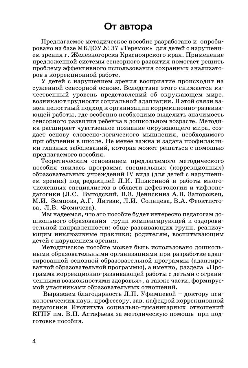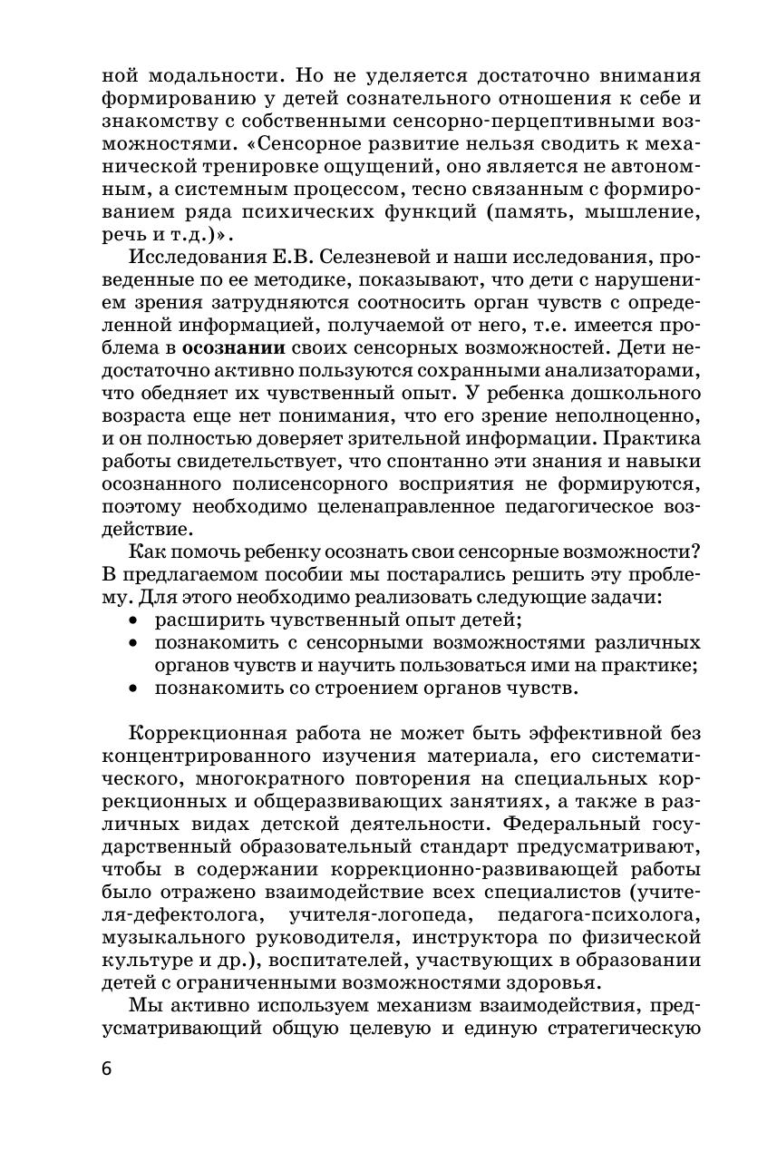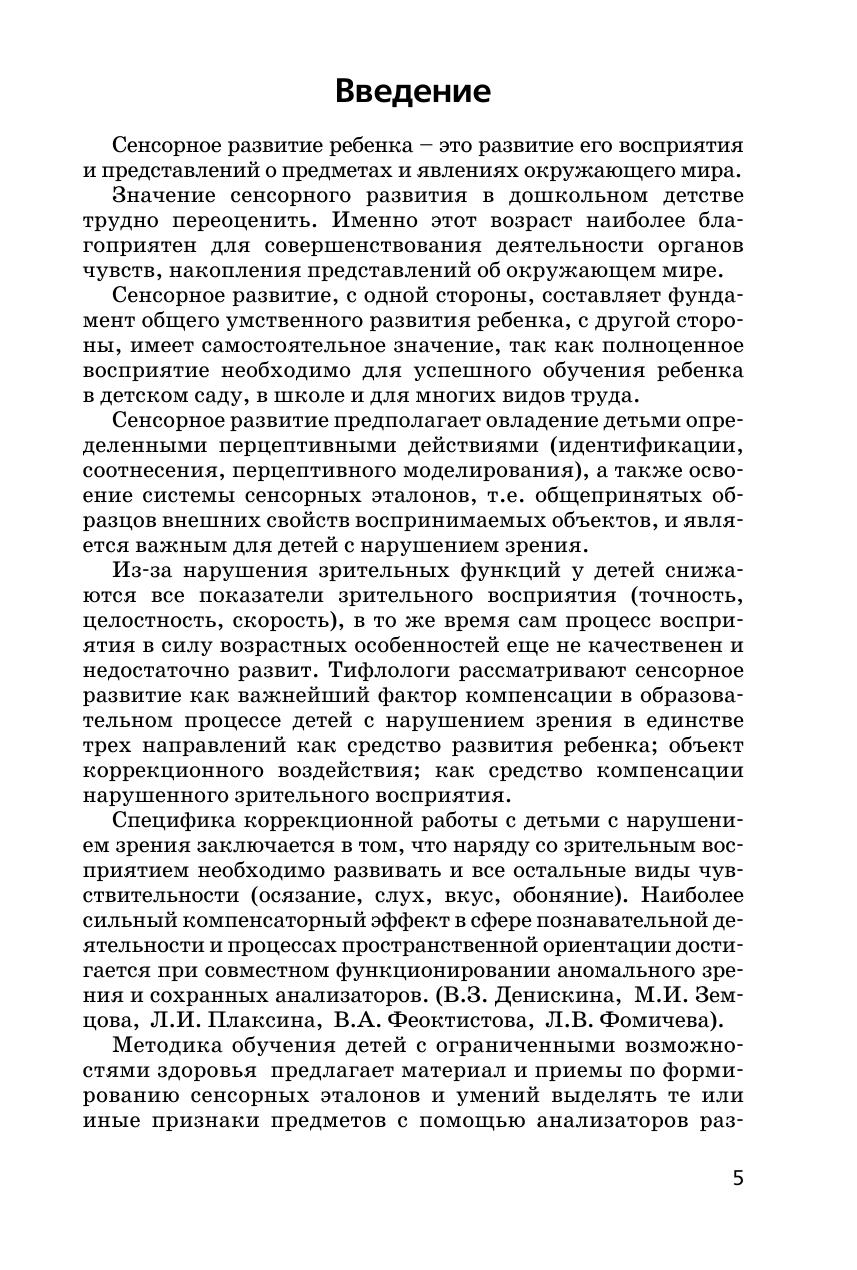В методическом пособии представлены тематические занятия по развитию у детей с нарушением зрения зрительного, слухового, тактильного восприятия, восприятия запахов и вкуса. Занятия рассчитаны на детей старшего дошкольного возраста. В ходе занятий используются игры и упражнения для активизации зрительных функций, снятия зрительного напряжения. Предлагаются задания, проблемные ситуации, способствующие активному использованию детьми анализаторов разной модальности, осознанному отношению к лечению глазного заболевания и способам преодоления ограничений жизнедеятельности, что способствует формированию здоровьесберегающей компетентности и имеет принципиально важное значение для реализации Федерального государственного стандарта дошкольного образования. В приложении даны различные игры для индивидуальной работы, стихи, загадки, а также иллюстративный материал. Пособие рассчитано на воспитателей, тифлопедагогов, учителей начальной школы и родителей.