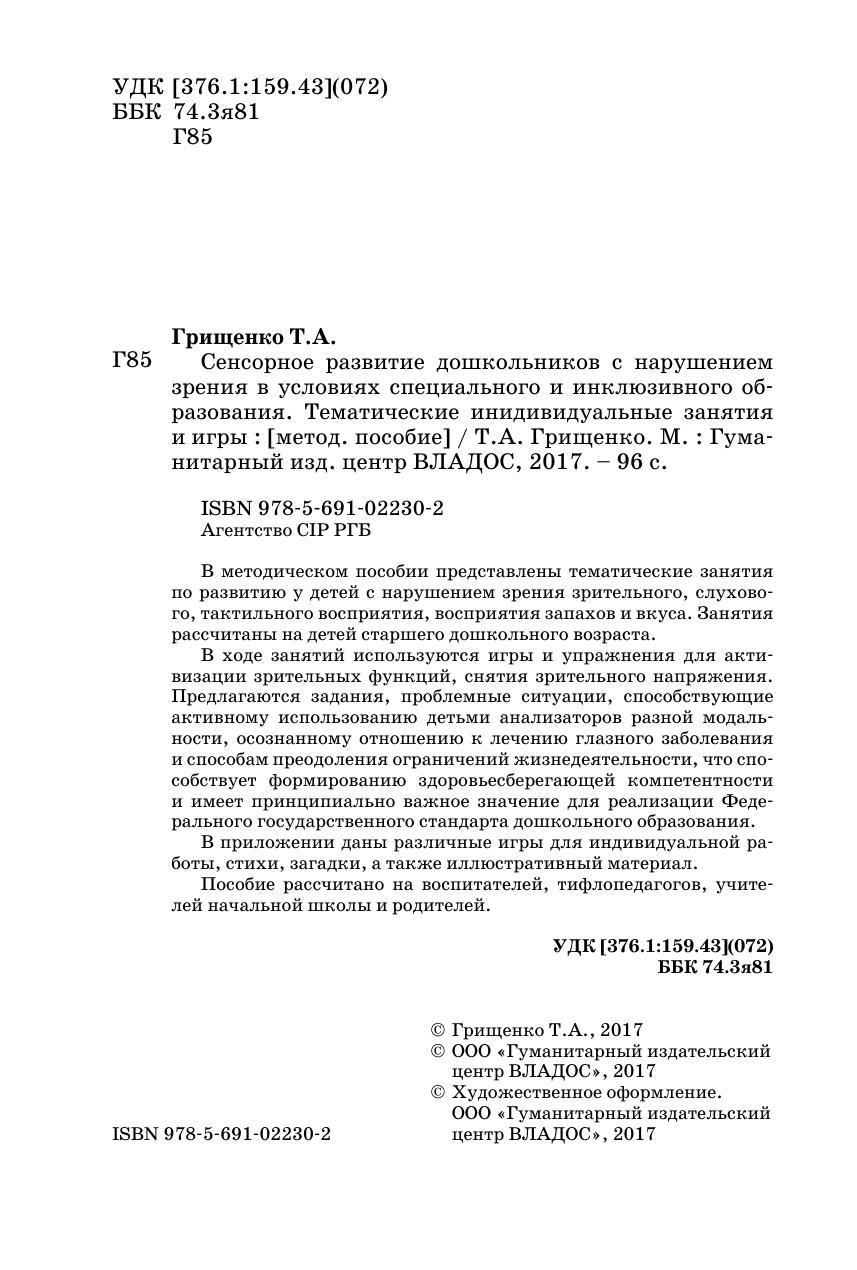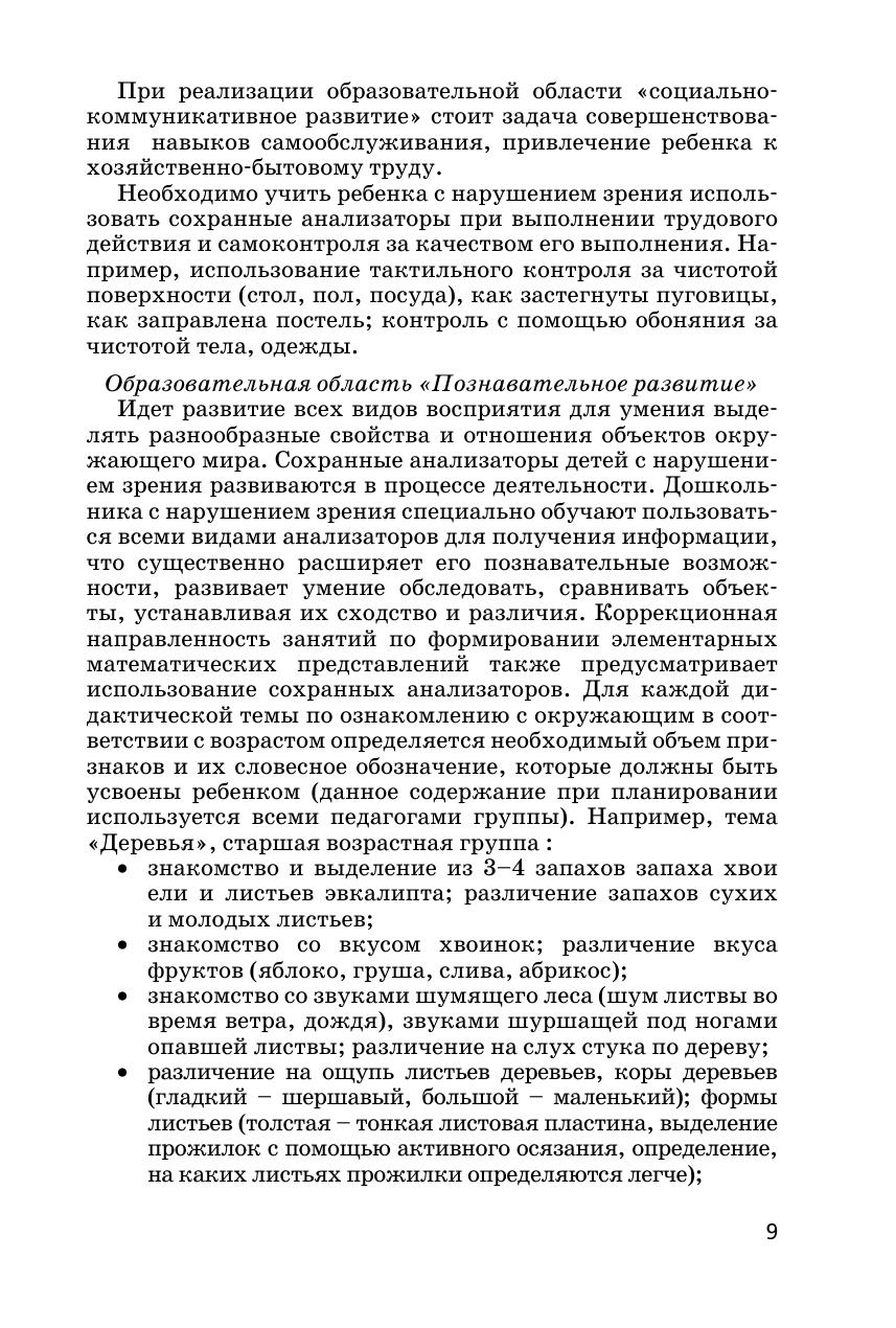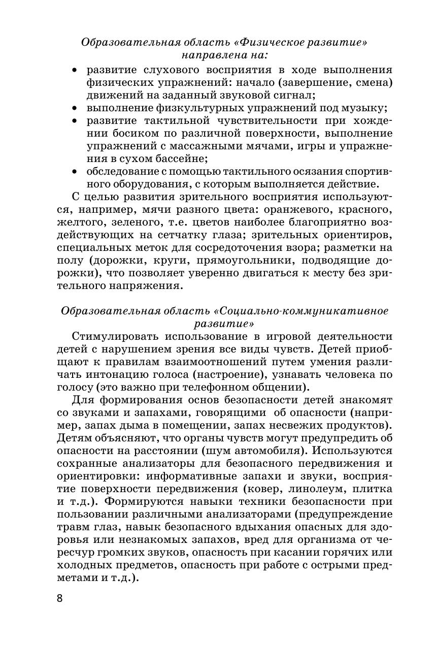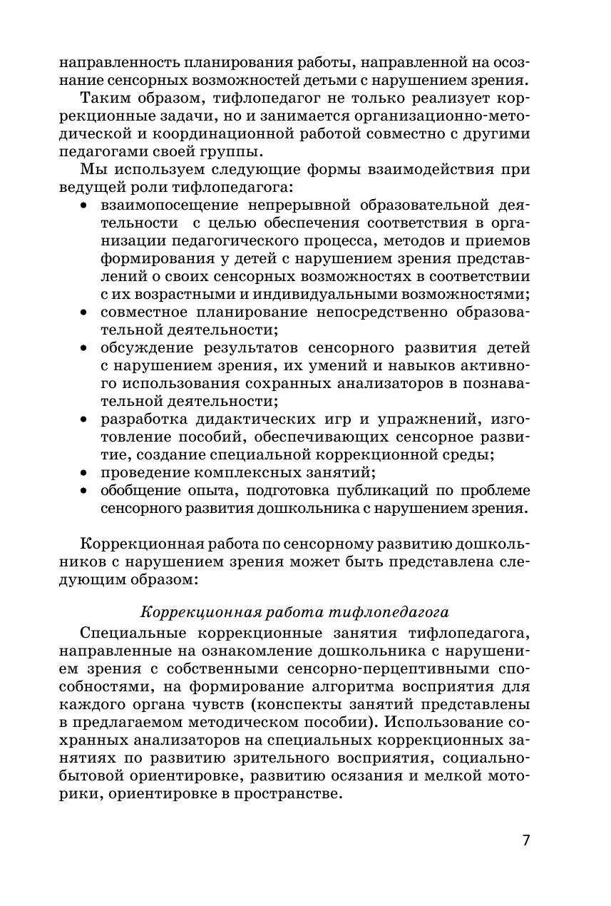 В методическом пособии представлены тематические занятия по развитию у детей с нарушением зрения зрительного, слухового, тактильного восприятия, восприятия запахов и вкуса. Занятия рассчитаны на детей старшего дошкольного возраста. В ходе занятий используются игры и упражнения для активизации зрительных функций, снятия зрительного напряжения. Предлагаются задания, проблемные ситуации, способствующие активному использованию детьми анализаторов разной модальности, осознанному отношению к лечению глазного заболевания и способам преодоления ограничений жизнедеятельности, что способствует формированию здоровьесберегающей компетентности и имеет принципиально важное значение для реализации Федерального государственного стандарта дошкольного образования. В приложении даны различные игры для индивидуальной работы, стихи, загадки, а также иллюстративный материал. Пособие рассчитано на воспитателей, тифлопедагогов, учителей начальной школы и родителей.