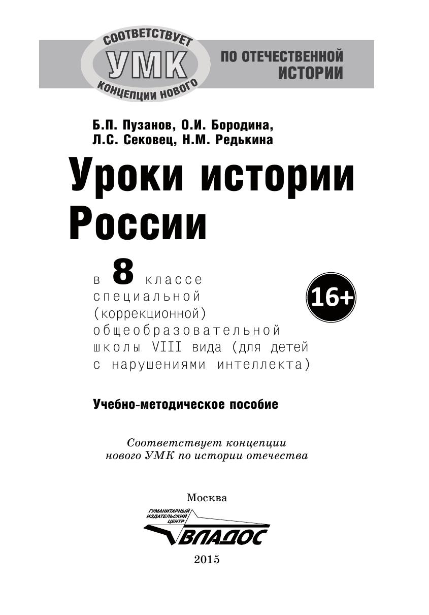 Уроки истории России в 8 классе специальной (коррекционной) общеобразовательной школы VIII вида (для детей с нарушениями интеллекта): учебно-методическое пособие