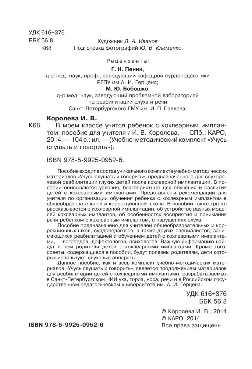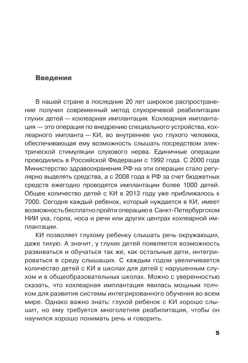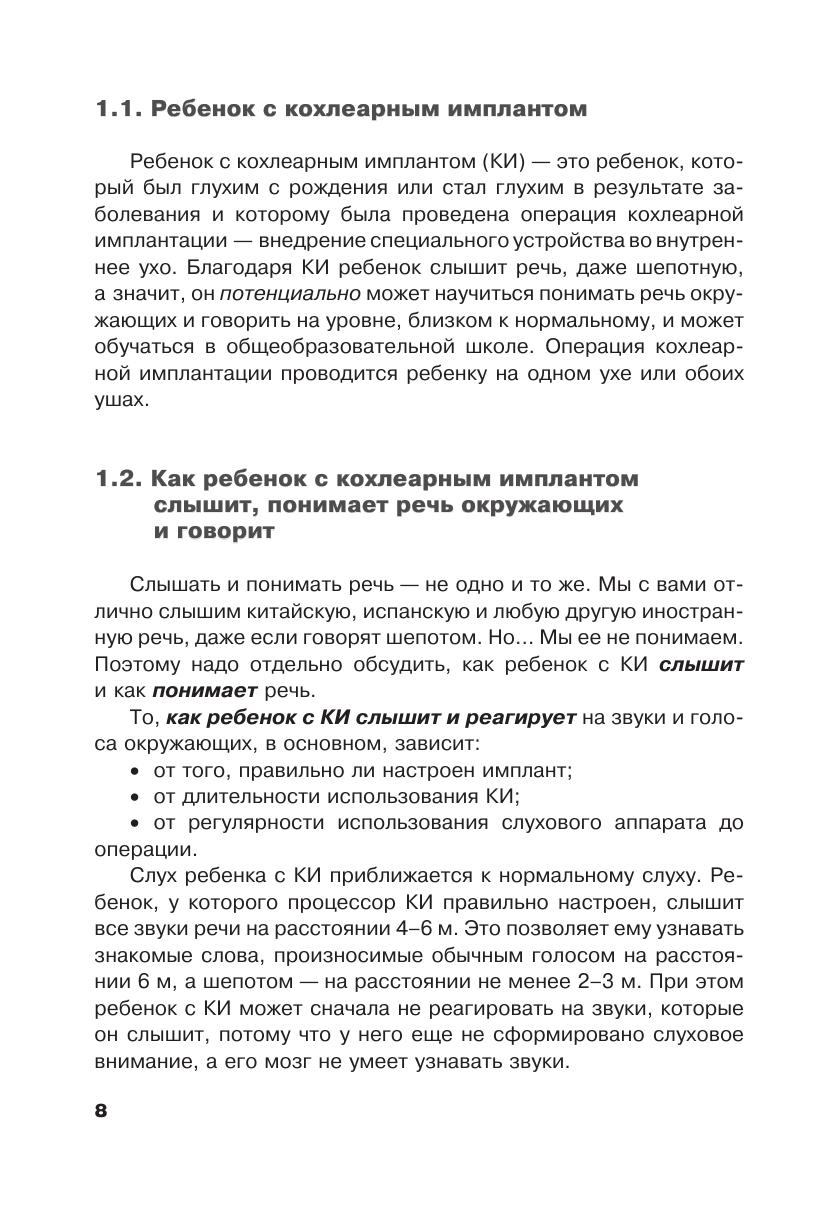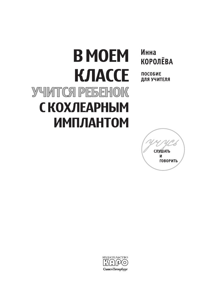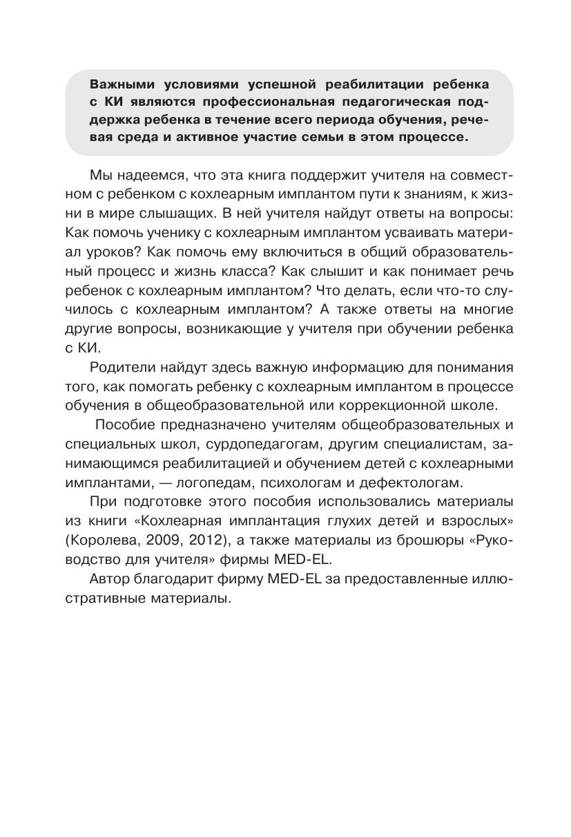Пособие предназначено для учителей общеобразовательных и коррекционных школ, сурдопедагогов, а также других специалистов, занимающихся реабилитацией и обучением детей с кохлеарными имплантами, — логопедов, дефектологов, психологов. Важную информацию найдут в нем родители детей с кохлеарными имплантами. Кроме того, советы, содержащиеся в пособии, будут полезны родителям, дети которых используют слуховые аппараты.