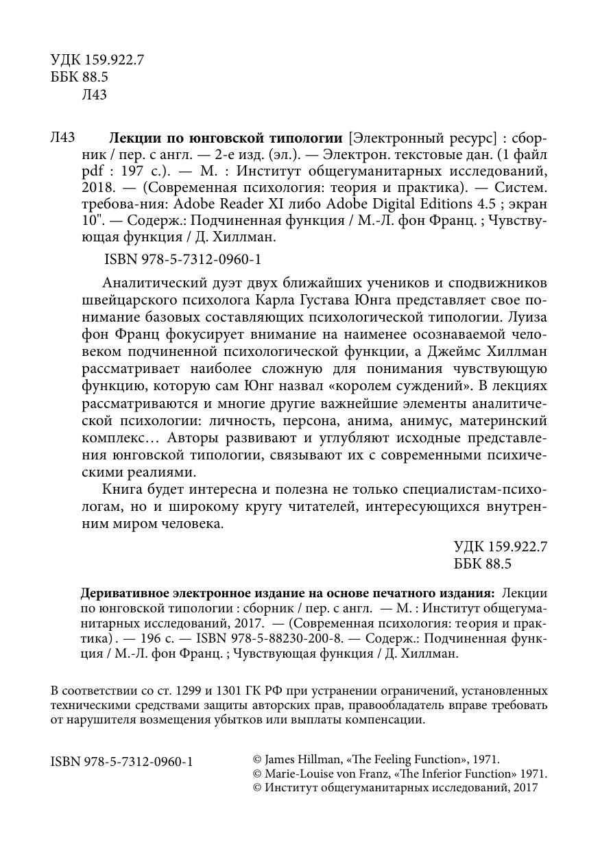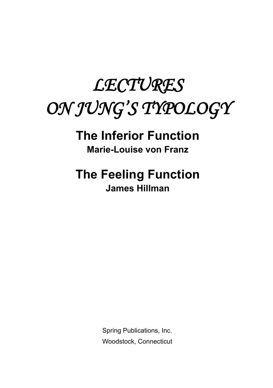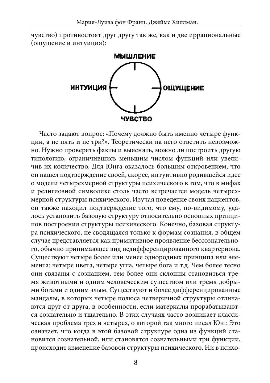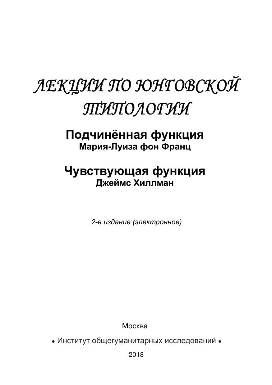 Аналитический дуэт двух ближайших учеников и сподвижников швейцарского психолога Карла Густава Юнга представляет свое понимание базовых составляющих психологической типологии. Луиза фон Франц фокусирует внимание на наименее осознаваемой человеком подчиненной психологической функции, а Джеймс Хиллман рассматривает наиболее сложную для понимания чувствующую функцию, которую сам Юнг назвал «королем суждений». В лекциях рассматриваются и многие другие важнейшие элементы аналитической психологии: личность, персона, анима, анимус, материнский комплекс... Авторы развивают и углубляют исходные представления юнговской типологии, связывают их с современными психическими реалиями. Книга будет интересна и полезна не только специалистам-психологам, но и широкому кругу читателей, интересующихся внутренним миром человека.