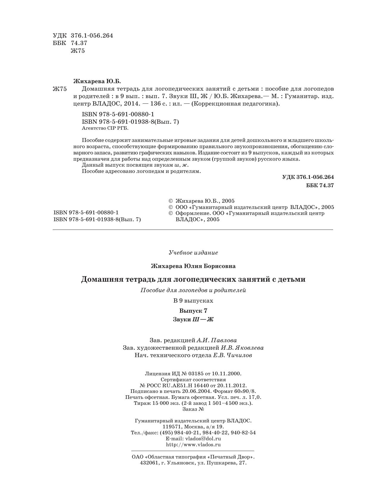Домашняя тетрадь для логопедических занятий с детьми: пособие для логопедов и родителей: в 9 вып.: вып. 7. Звуки Ш, Ж