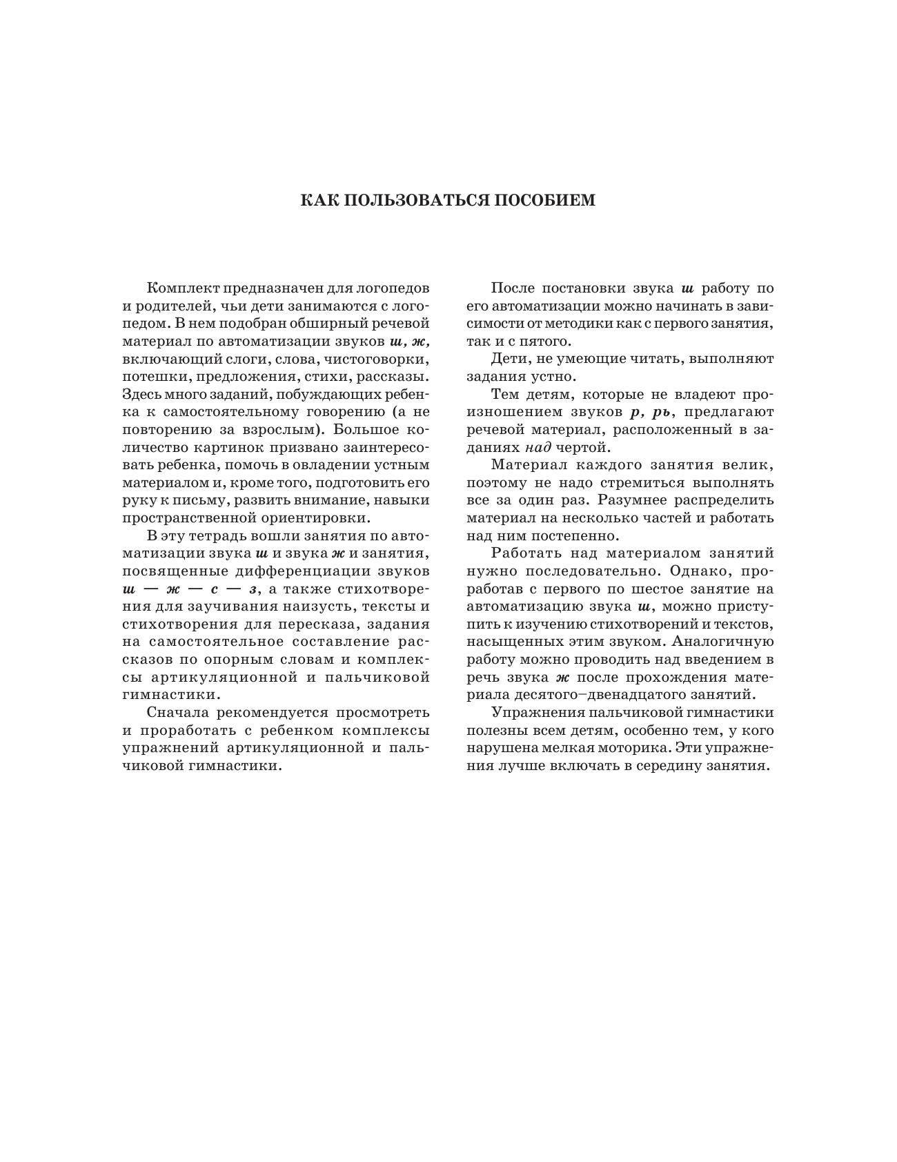 Пособие содержит занимательные игровые задания для детей дошкольного и младшего школьного возраста, способствующие формированию правильного звукопроизношения, обогащению словарного запаса, развитию графических навыков. Издание состоит из 9 выпусков, каждый из которых предназначен для работы над определенным звуком (группой звуков) русского языка. Данный выпуск посвящен звукам ш, ж. Пособие адресовано логопедам и родителям