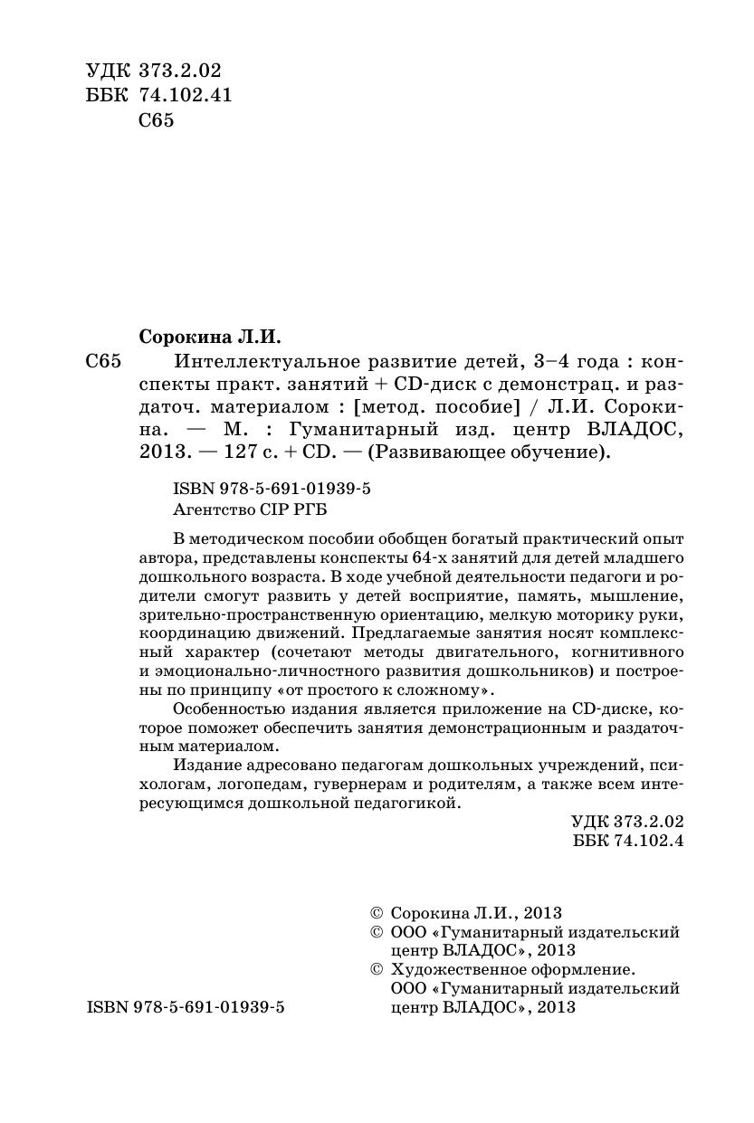 В методическом пособии обобщен богатый практический опыт автора, представлены конспекты 64-х занятий для детей младшего дошкольного возраста. В ходе учебной деятельности педагоги и родители смогут развить у детей восприятие, память, мышление, зрительно-пространственную ориентацию, мелкую моторику руки, координацию движений. Предлагаемые занятия носят комплексный характер (сочетают методы двигательного, когнитивного и эмоционально-личностного развития дошкольников) и построены по принципу «от простого к сложному». Особенностью издания является приложение на CD-диске, которое поможет обеспечить занятия демонстрационным и раздаточным материалом. Издание адресовано педагогам дошкольных учреждений, психологам, логопедам, гувернерам и родителям, а также всем интересующимся дошкольной педагогикой.