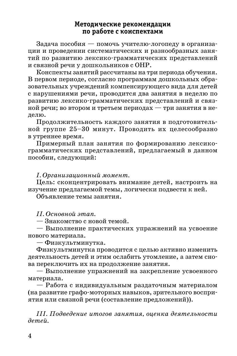 Представленные в пособии конспекты занятий по формированию лексико-грамматических средств языка и связной речи у детей с ОНР для подготовительной к школе группы детского сада, включают методические рекомендации, примерное понедельное тематическое планирование занятий на каждый период обучения в подготовительной группе детского сада (которое специалисты могут взять его за основу в своей работе). Работа по данным конспектам позволит обобщить и систематизировать знания детей, обогатить их словарный запас, помочь усвоить грамматические категории, развить связную речь, память, внимание, мышление, зрительное, слуховое, пространственное восприятие, а также общую и мелкую моторику, графо-моторные навыки. Пособие адресовано логопедам и воспитателям логопедических групп и детских садов.