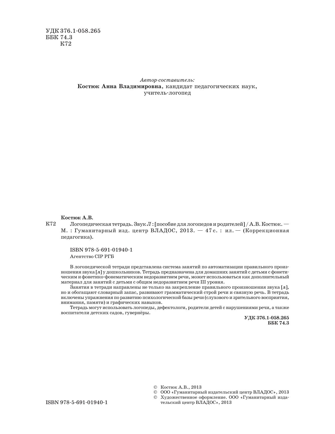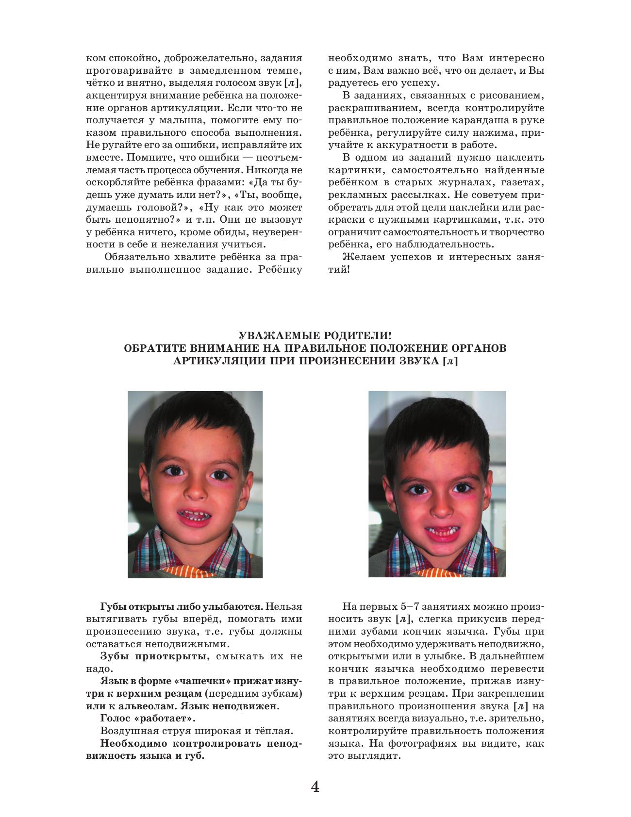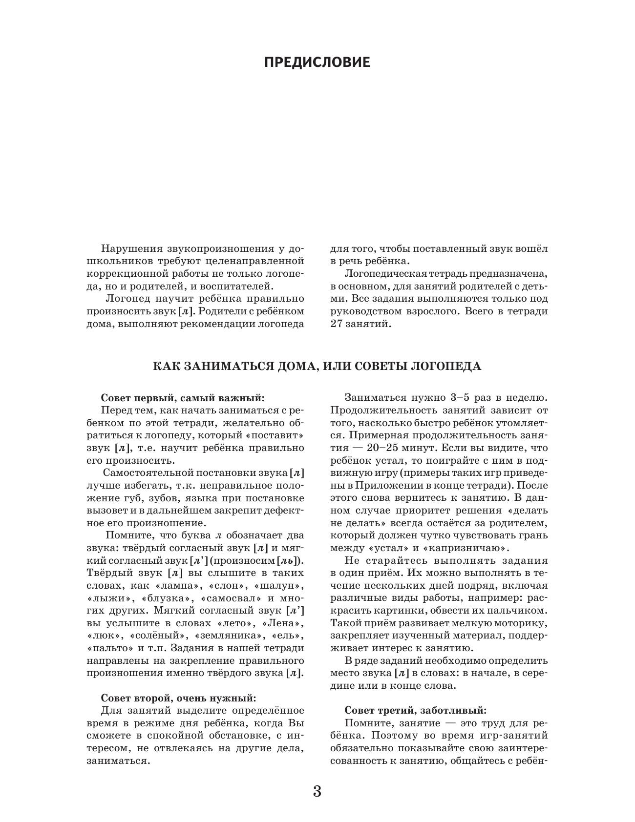 В логопедической тетради представлена система занятий по автоматизации правильного произношения звука [л] у дошкольников. Тетрадь предназначена для домашних занятий с детьми с фонетическим и фонетико-фонематическим недоразвитием речи, может использоваться как дополнительный материал для занятий с детьми с общим недоразвитием речи III уровня. Занятия в тетради направлены не только на закрепление правильного произношения звука [л], но и обогащают словарный запас, развивают грамматический строй речи и связную речь. В тетрадь включены упражнения по развитию психологической базы речи (слухового и зрительного восприятия, внимания, памяти) и графических навыков. Тетрадь могут использовать логопеды, дефектологи, родители детей с нарушениями речи, а также воспитатели детских садов, гувернёры.