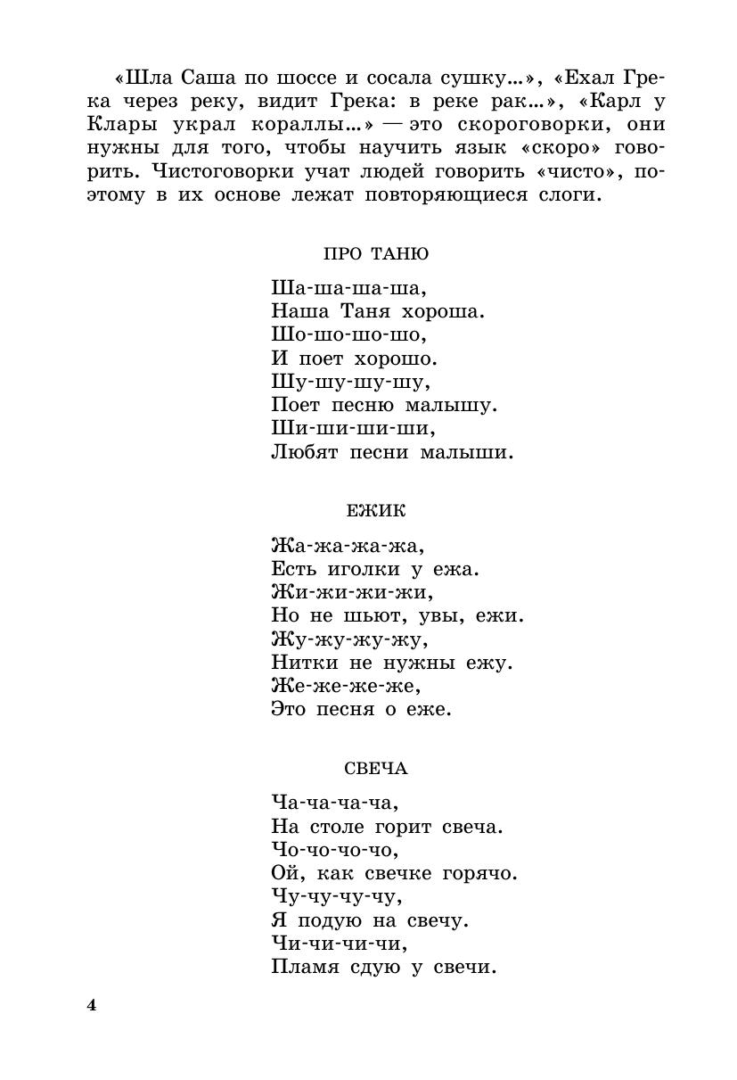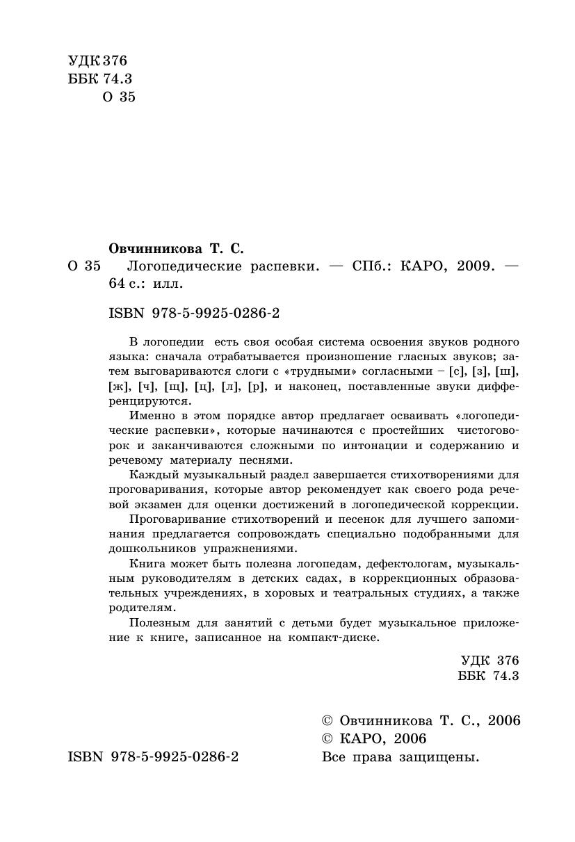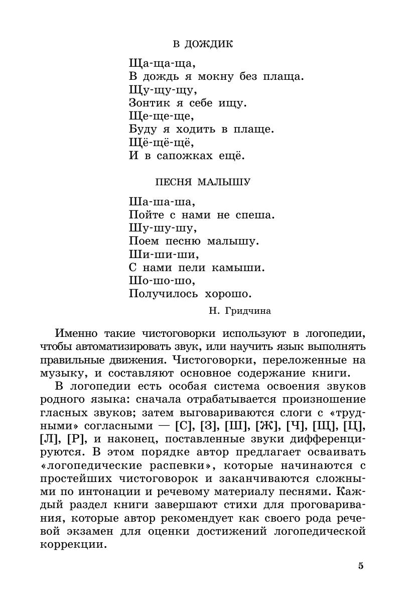 В логопедии есть своя особая система освоения звуков родного языка: сначала отрабатывается произношение гласных звуков затем выговариваются слоги с «трудными» согласными – [с], [з], [ш], [ж], [ч], [щ], [ц], [л], [р], и наконец, поставленные звуки дифференцируются. Именно в этом порядке автор предлагает осваивать «логопедические распевки», которые начинаются с простейших чистоговорок и заканчиваются сложными по интонации и содержанию и речевому материалу песнями. Каждый музыкальный раздел завершается стихотворениями для проговаривания, которые автор рекомендует как своего рода речевой экзамен для оценки достижений в логопедической коррекции. Проговаривание стихотворений и песенок для лучшего запоминания предлагается сопровождать специально подобранными для дошкольников упражнениями. Книга может быть полезна логопедам, дефектологам, музыкальным руководителям в детских садах, в коррекционных образовательных учреждениях, в хоровых и театральных студиях, а также родителям. Полезным для занятий с детьми будет музыкальное приложение к книге, записанное на компакт-диске.
