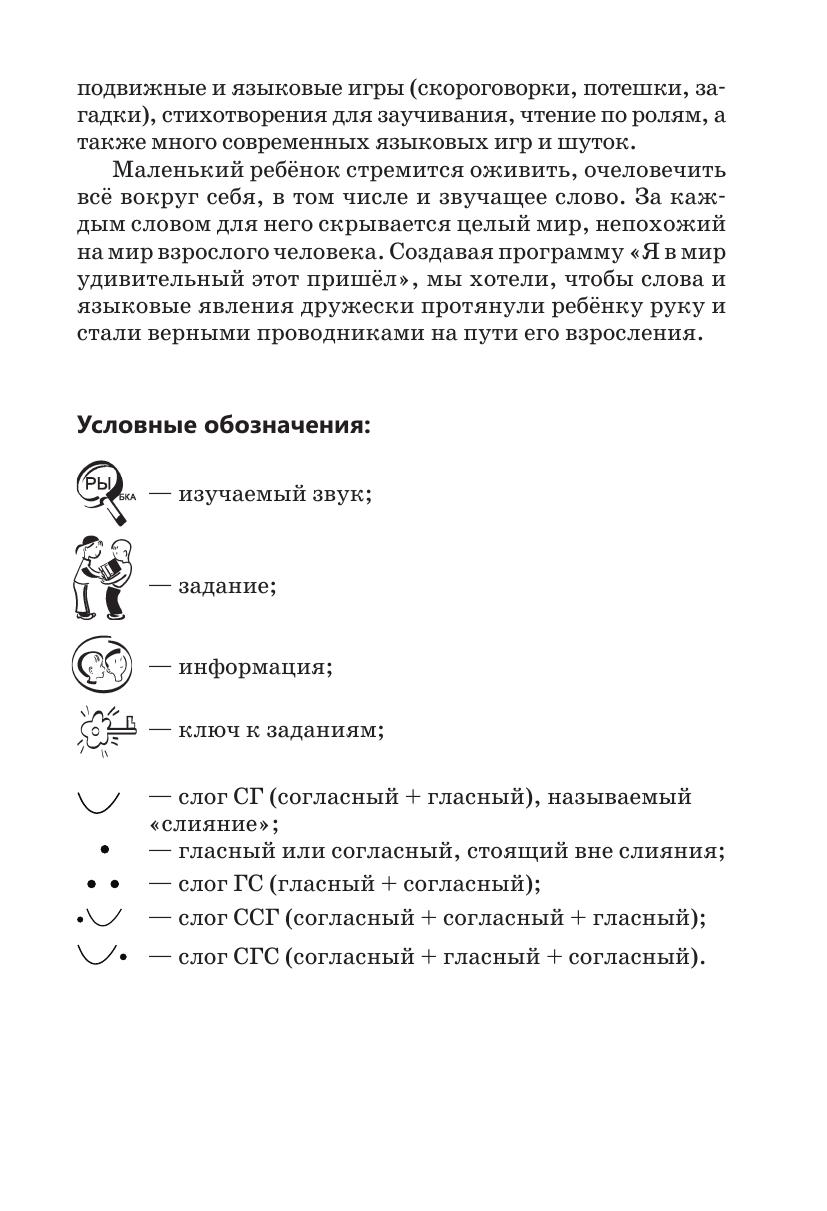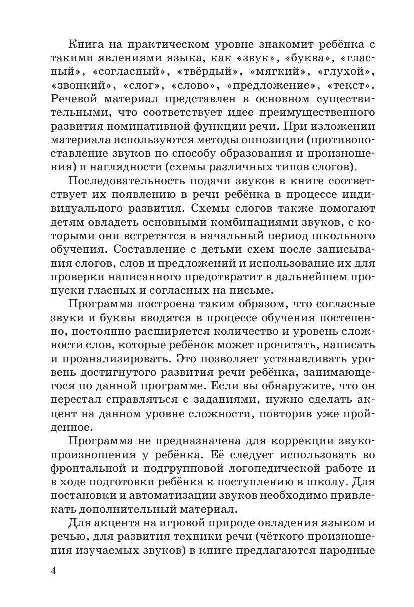 Книга поможет педагогу или родителям познакомить дошкольника с такими явлениями языка, как «звук»,«буква», «гласный», «согласный», «твердый», «мягкий», «глухой», «звонкий»,«слог»,«слово»,«предложение»,«текст». Последовательность подачи звуков в ней соответствует их появлению в речи ребенка в процессе индивидуального развития. Схемы слогов помогут детям овладеть основными комбинациями звуков, с которыми они встретятся в начальный период школьного обучения. Составление с ребятами схем после записывания слогов, слов и предложений и использование их для проверки написанного предотвратит в дальнейшем пропуски гласных и согласных на письме. Для акцента на игровой природе овладения языком и речью, для развития техники речи (четкого произношения изучаемых звуков) в книге предлагаются народные подвижные и языковые игры (скороговорки, потешки, загадки, шутки), стихотворения для заучивания, тексты для чтения по ролям, а также много современного редкого игрового материала (палиндромы, логогрифы, метаграммы).