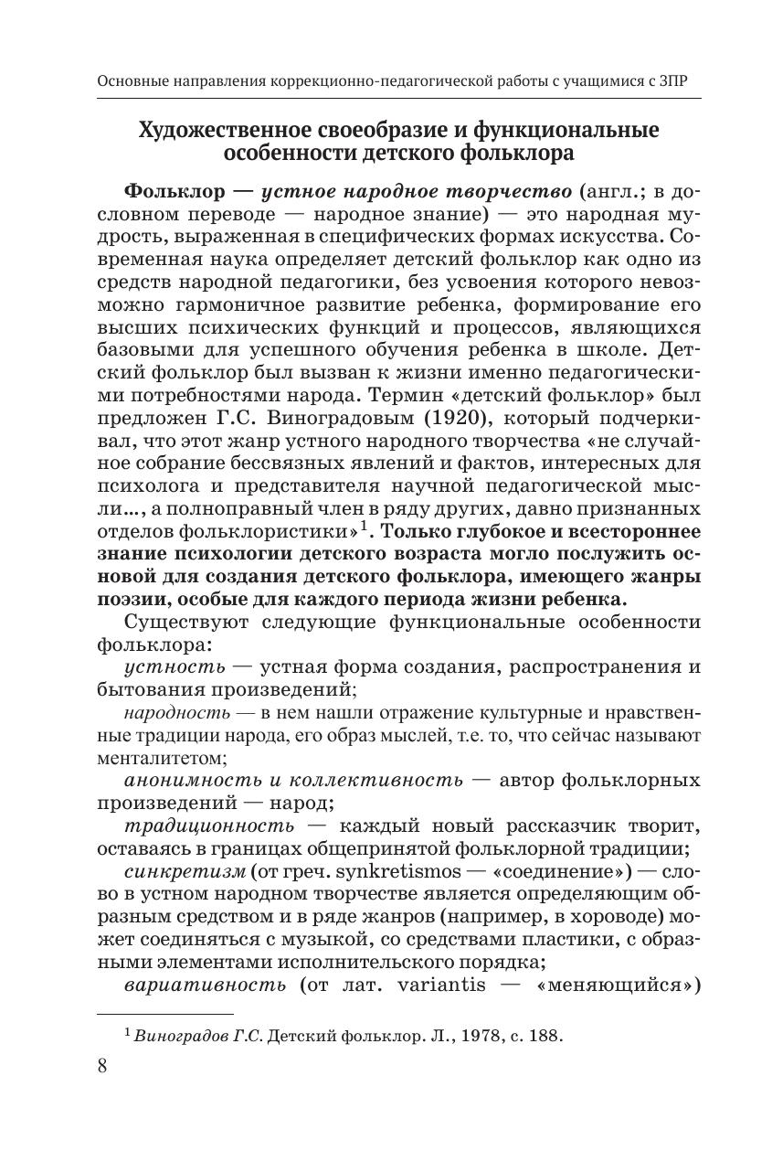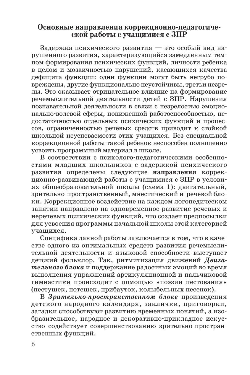 Пособие посвящено устранению причин неуспеваемости детей с задержкой психического развития (ЗПР) в школе. Методика, представленная в пособии, основана на использовании в ходе коррекционно-развивающей работы с детьми фольклорного материала, и направлена на формирование двигательной сферы, совершенствование зрительно-пространственных функций и временных понятий, развитие речи и памяти. Применение методики поможет ребенку адаптироваться к условиям школьной жизни, окажет регулирующее воздействие на его поведение, обеспечит развитие личности ребенка в процессе художественного творчества. Представленный в пособии материал также можно использовать на уроках русского языка, для литературного чтения, изобразительной деятельности и во внеклассной работе. Пособие предназначено логопедам и педагогам-дефектолам в работе с детьми с ЗПР.