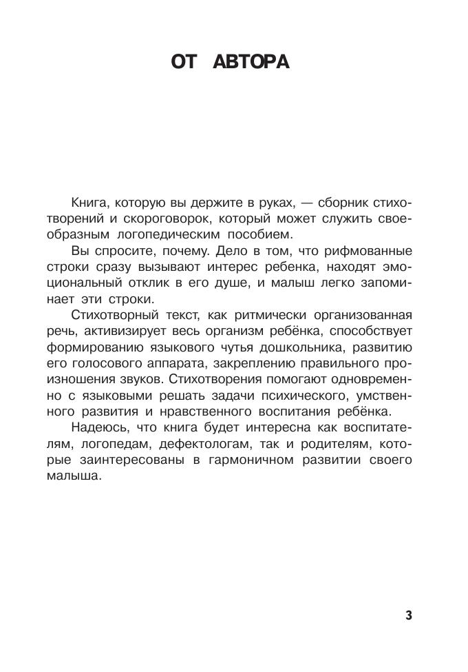 Книга представляет собой сборник стихотворений и скороговорок. Поэтическое слово способствует обогащению лексики, развитию языкового чутья у детей. Стихотворный текст как ритмически организованная речь активизирует весь организм дошкольника, способствует развитию его голосового аппарата, закреплению правильного произношения звуков. Стихотворения находят эмоциональный отклик в душе ребенка, делают увлекательным предлагаемый к изучению материал, а педагогам и родителям они помогают одновременно с речевыми решать задачи психического, умственного развития и нравственного воспитания малыша.