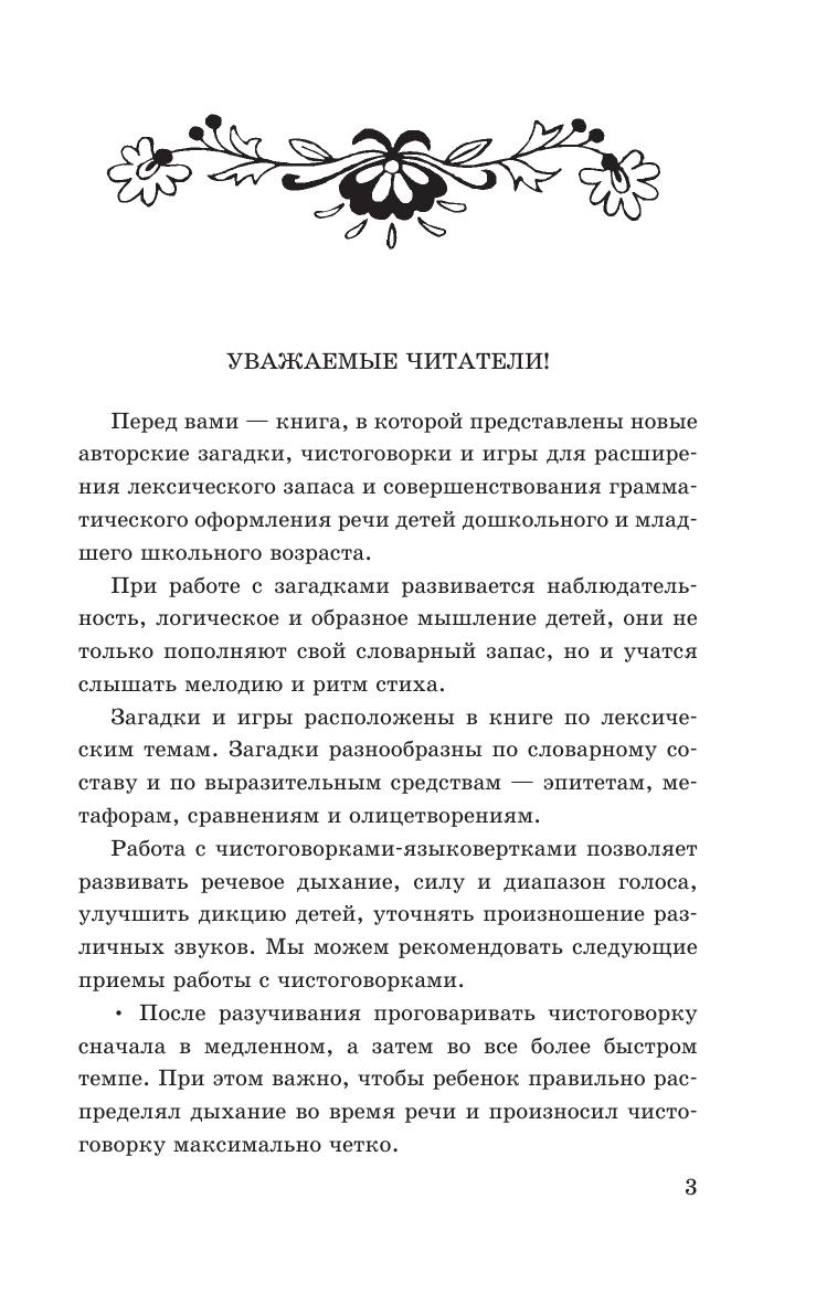 В книге представлены авторские загадки, чистоговорки и игры для расширения лексического запаса и совершенствования грамматического оформления речи детей дошкольного и младшего школьного возраста. Загадки и игры расположены по лексическим темам. Работа с чистоговорками-языковертками позволяет развивать у ребенка речевое дыхание, силу и диапазон голоса, улучшать дикцию, уточнять произношение звуков. Предложенные загадки, чистоговорки и игры не только внесут разнообразие в занятия логопеда и воспитателя с детьми, но и помогут в развитии памяти, внимания и мышления малышей.
