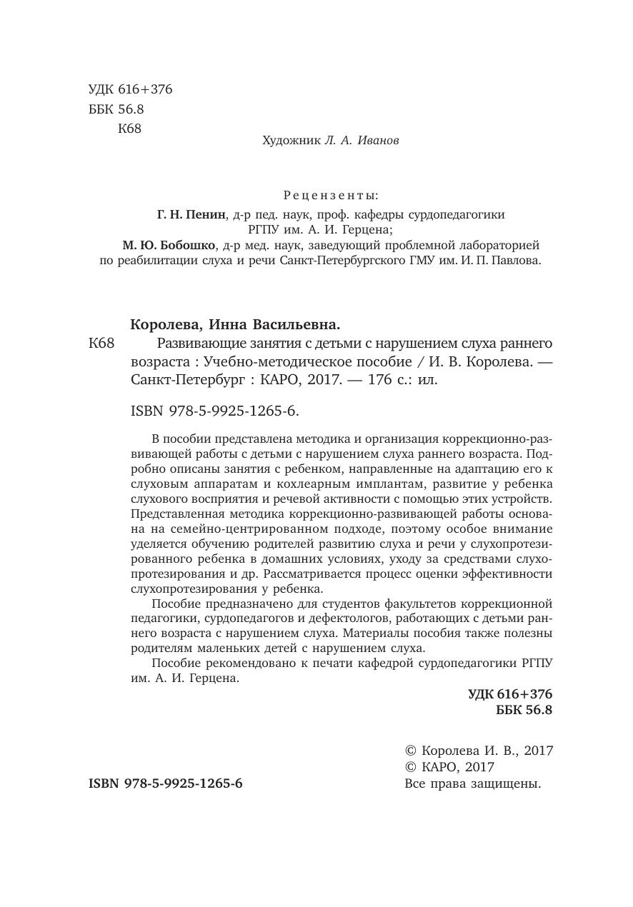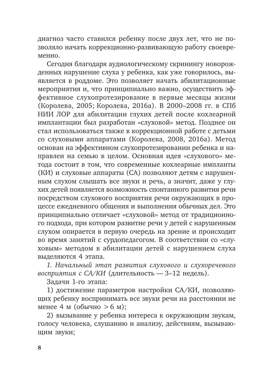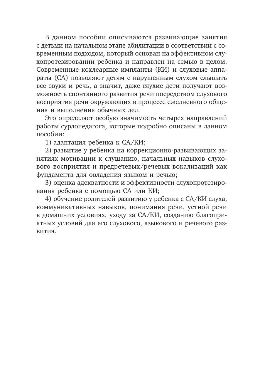 В пособии представлена методика и организация коррекционно-развивающей работы с детьми с нарушением слуха раннего возраста. Подробно описаны занятия с ребенком, направленные на адаптацию его к слуховым аппаратам и кохлеарным имплантам, развитие у ребенка слухового восприятия и речевой активности с помощью этих устройств. Представленная методика коррекционно-развивающей работы основана на семейно-центрированном подходе, поэтому особое внимание уделяется обучению родителей развитию слуха и речи у слухопротезированного ребенка в домашних условиях, уходу за средствами слухопротезирования и др. Рассматривается процесс оценки эффективности слухопротезирования у ребенка. Пособие предназначено для студентов факультетов коррекционной педагогики, сурдопедагогов и дефектологов, работающих с детьми раннего возраста с нарушением слуха. Материалы пособия также полезны родителям маленьких детей с нарушением слуха. Пособие рекомендовано к печати кафедрой сурдопедагогики РГПУ им. А. И. Герцена.