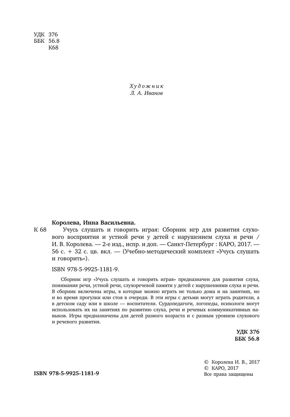 Сборник игр «Учусь слушать и говорить играя» предназначен для развития слуха, понимания речи, устной речи, слухоречевой памяти у детей с нарушениями слуха и речи.