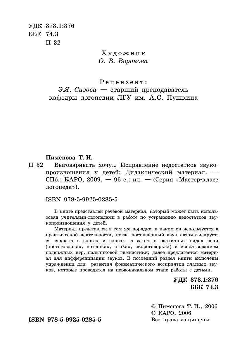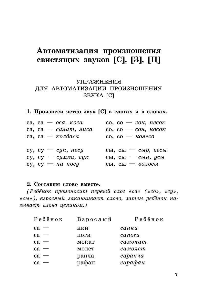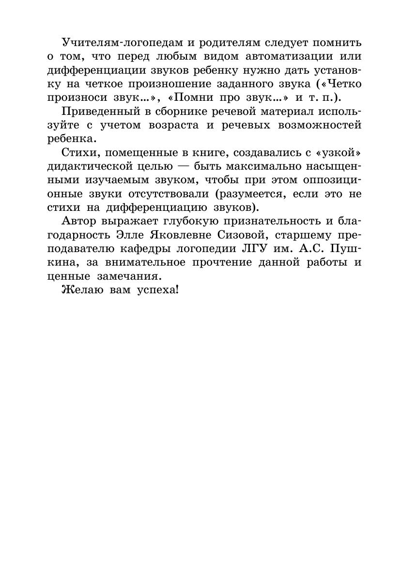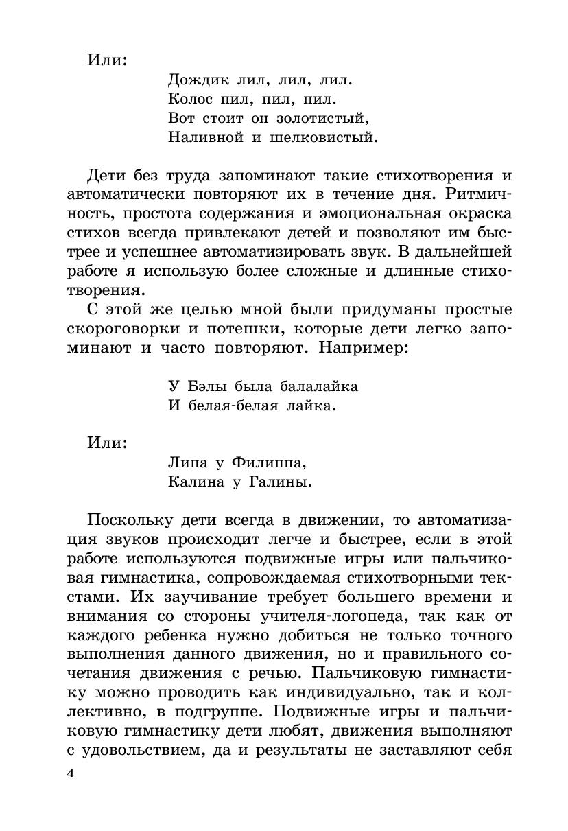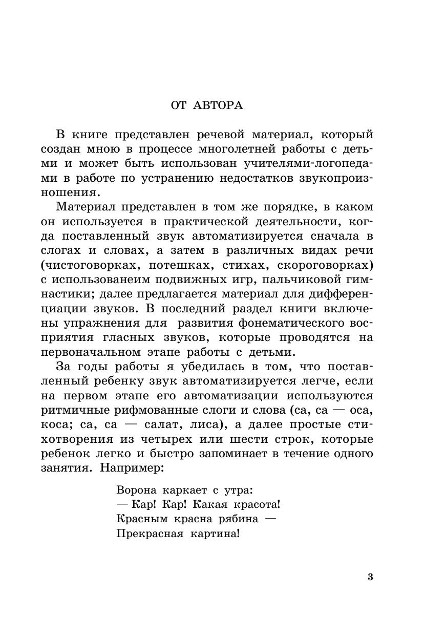 В книге представлен речевой материал, который может быть использован учителями-логопедами в работе по устранению недостатков звукопроизношения у детей. Материал представлен в том же порядке, в каком он используется в практической деятельности, когда поставленный звук автоматизируется сначала в слогах и словах, а затем в различных видах речи (чистоговорках, потешках, стихах, скороговорках) с использованием подвижных игр, пальчиковой гимнастики; далее предлагается материал для дифференциации звуков. В последний раздел книги включеныупражнения для развития фонематического восприятия гласных звуков, которые проводятся на первоначальном этапе работы с детьми.