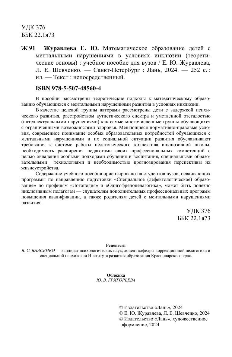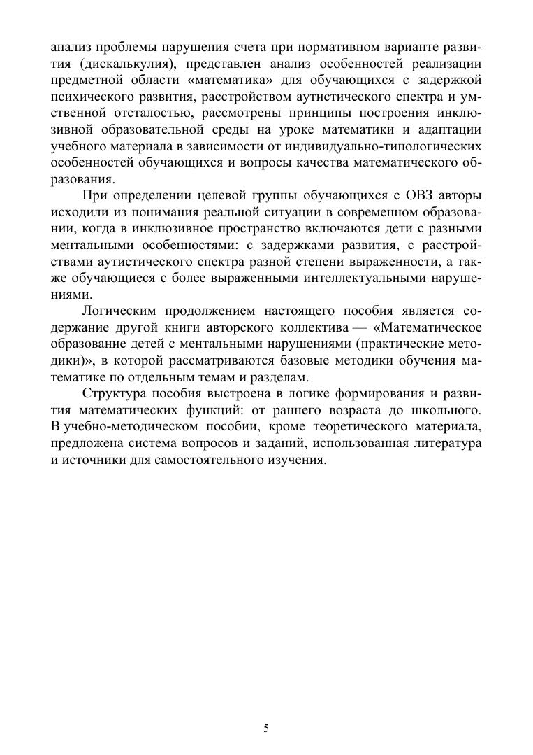 В пособии рассмотрены теоретические подходы к математическому образованию обучающихся с ментальными нарушениями развития в условиях инклюзии. В качестве целевой группы авторами рассмотрены дети с задержкой психического развития, расстройством аутистического спектра и умственной отсталостью (интеллектуальными нарушениями) как самые многочисленные группы обучающихся с ограниченными возможностями здоровья. Меняющиеся нормативно-правовые условия, современное понимание особых образовательных потребностей обучающихся с ментальными нарушениями и их социальной ситуации развития обуславливают требования к системе работы педагогического коллектива инклюзивной школы, необходимость расширения педагогами своих профессиональных компетенций с целью овладения особыми подходами обучения и воспитания, специальными образовательными технологиями и необходимостью прогнозирования перспективы их жизнеустройства. Содержание учебного пособия ориентировано на студентов вузов, осваивающих программы по направлению подготовки «Специальное (дефектологическое) образо-вание» по профилям «Логопедия» и «Олигофренопедагогика», может быть полезно инклюзивным педагогам — слушателям дополнительных профессиональных программ повышения квалификации, а также родителям детей с ментальными нарушениями развития.